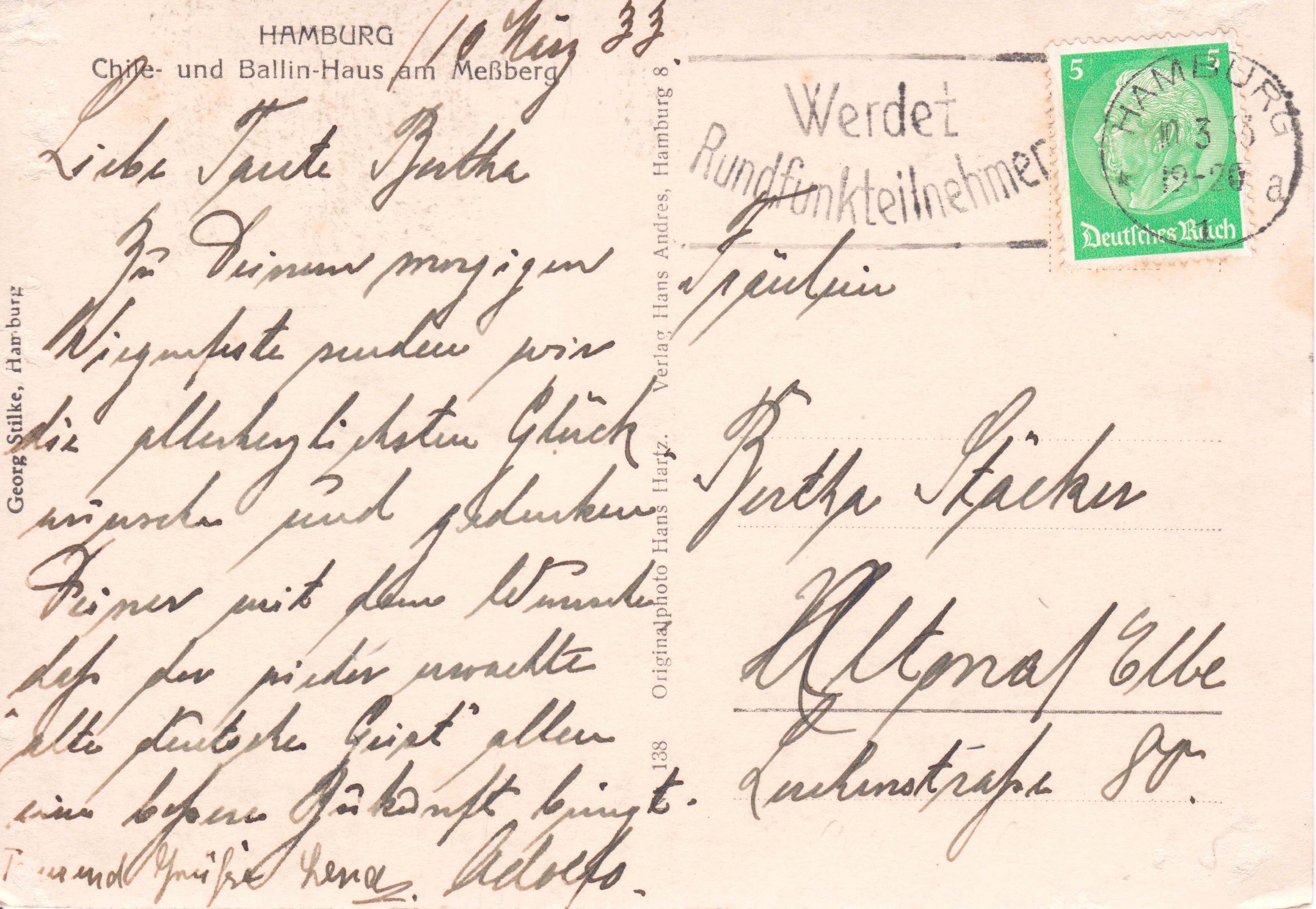Postkarte, adresssiert nach "Altona/Elbe", aufgegeben am 10.03.1933 in HAMBURG, dem Ortstarif entsprechend freigemacht mit 5 Pf per Einzelfrankatur der Dauerserie Hindenburg: