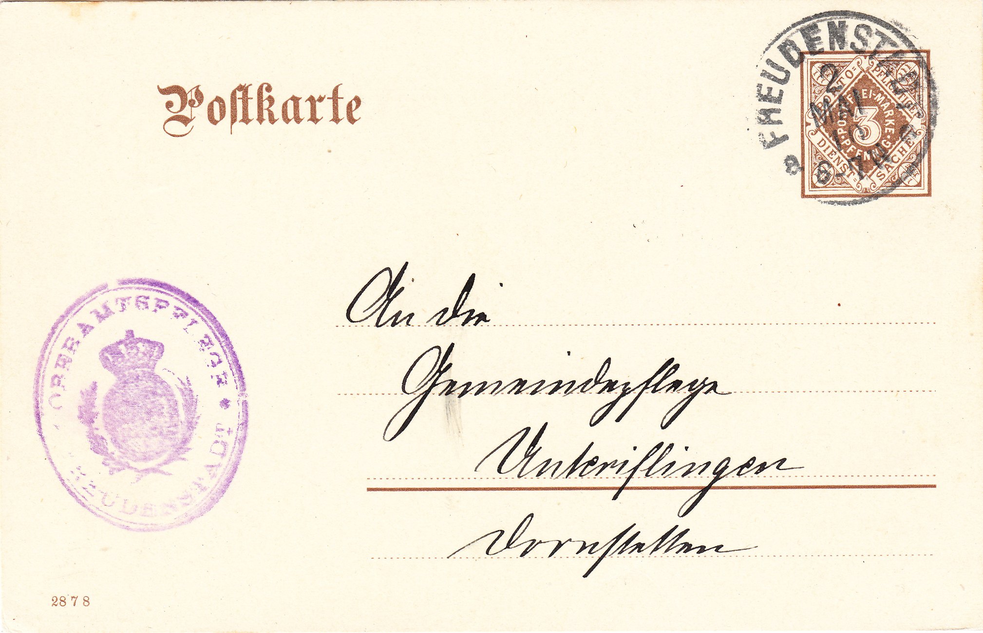Unteriflingen, ein Teil der heutigen Gemeinde Schopfloch, sowie Dornstetten gehörten beide zum Oberamt Freudenstadt, weshalb in diesem Falle der seit dem 01.04.1908 gültige ermäßigte Tarif von 3 Pfennig für den Oberamtsverkehr galt.