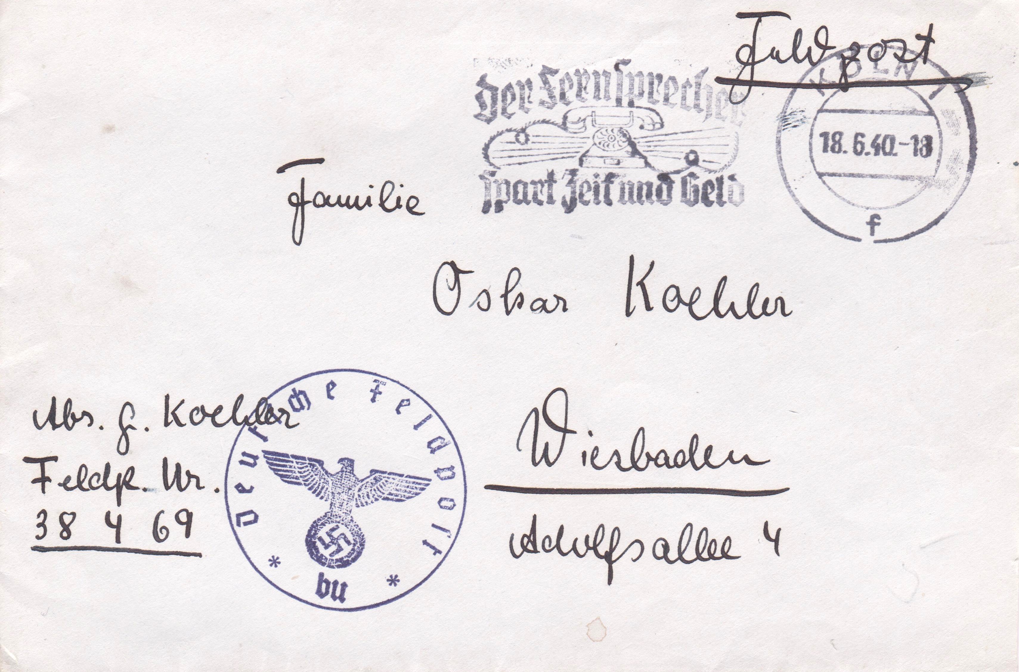 Die nach "Köln-Holweide" adressierte Sendung lief über BERLIN O 17, wo am 23.12.1941 um 11 Uhr ein Handstempel "Nachträglich entwertet" als Durchlaufstempel abgeschlagen wurde: