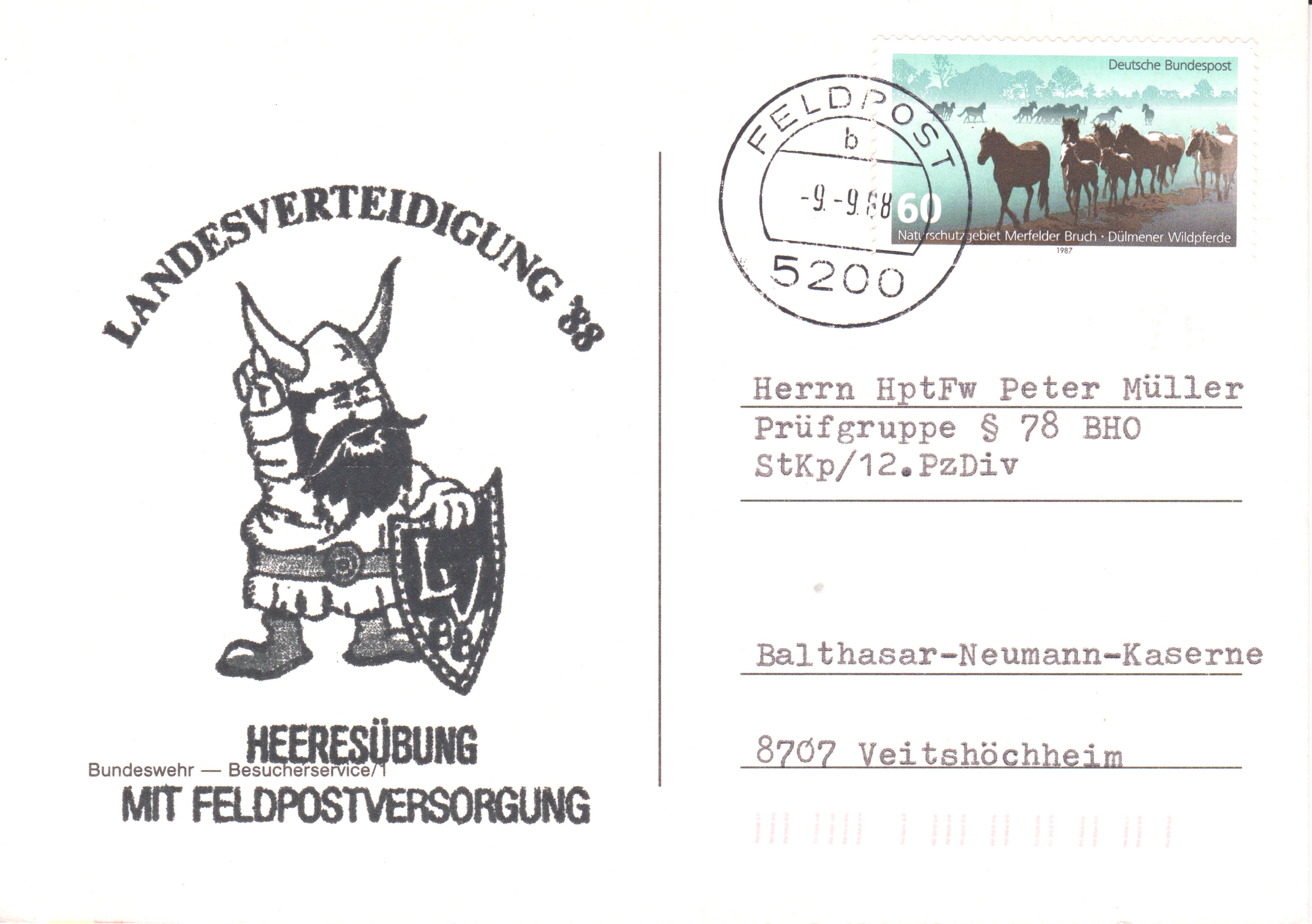 Dieser Beleg wurde am 09.09.1988 während der Übung "LANDESVERTEIDIGUNG 88" aufgegeben bei FELDPOST 5200, Tagesstempel mit Kennbuchstabe "b":