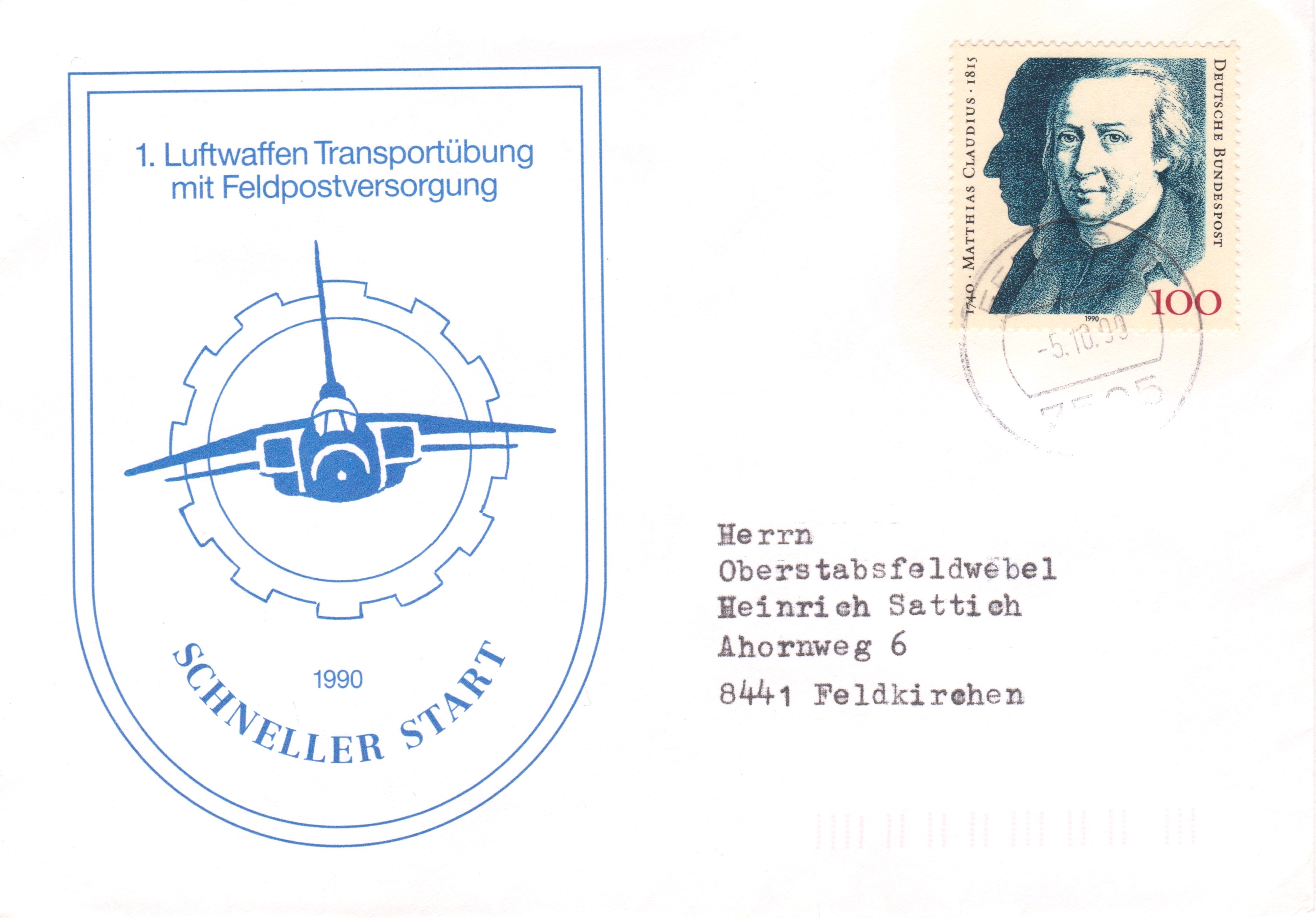 Brief, aufgegeben während der 1. Luftwaffen Transportübung mit Feldpostversorgung "SCHNELLER START" 1990, Stempel "FELDPOST 7505":