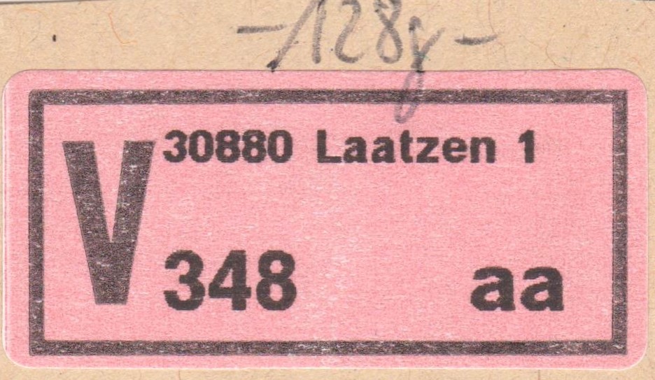 V-Zettel 30880 Laatzen 1 mit der Nummer "348 aa" für einen Wertbrief mit einem Gewicht von 128 Gramm: