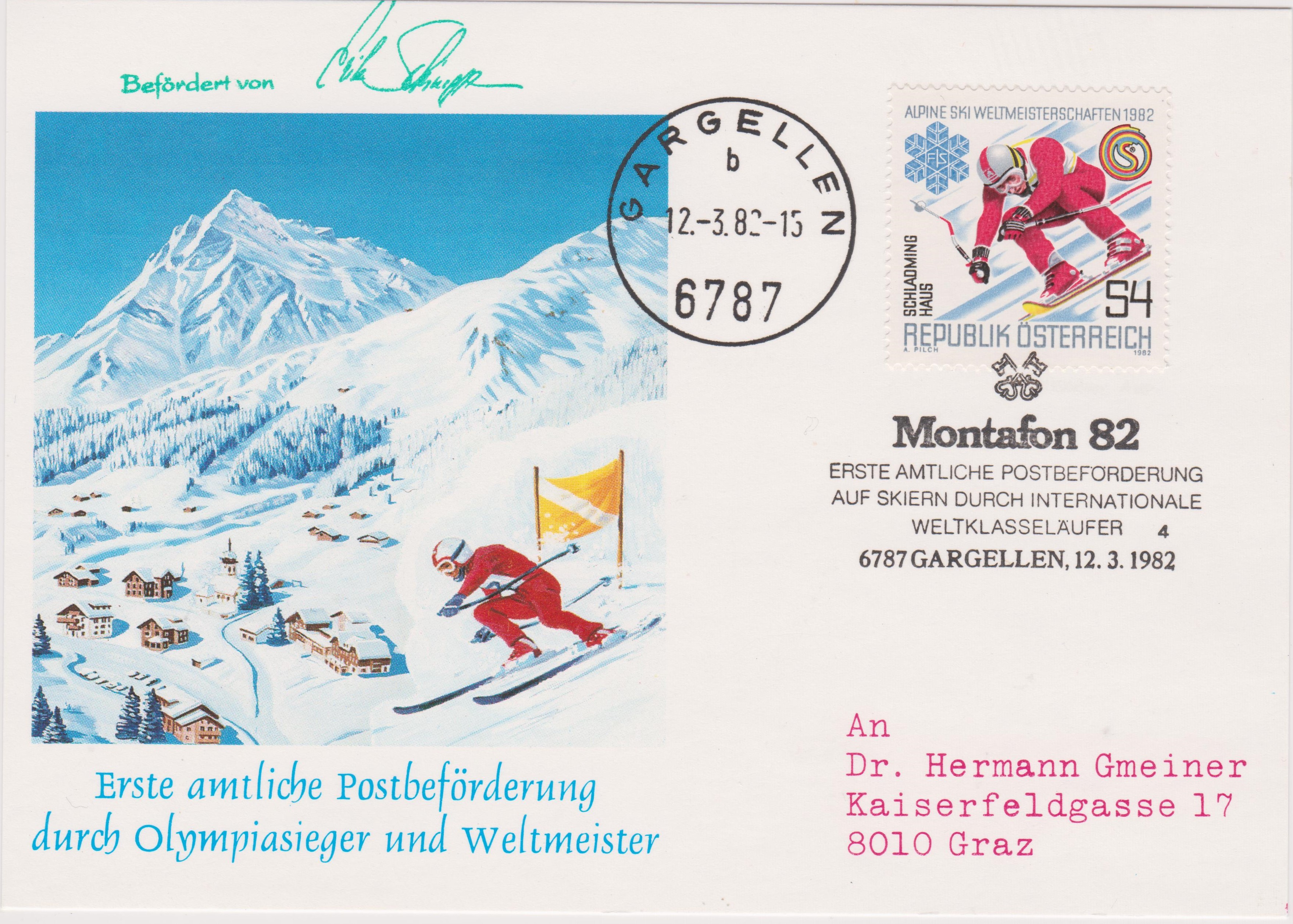 Am 12.03.1982 fand während der "Montafon 82" die "Erste AMTLICHE POSTBEFÖRDERUNG AUF SKIERN DURCH INTERNATIONALE WELTKLASSELÄUFER" statt. Oben links wurde eingedruckt "Befördert von", gefolgt vom Namen des jeweiligen Skifläufers, hier "Christl Haas".