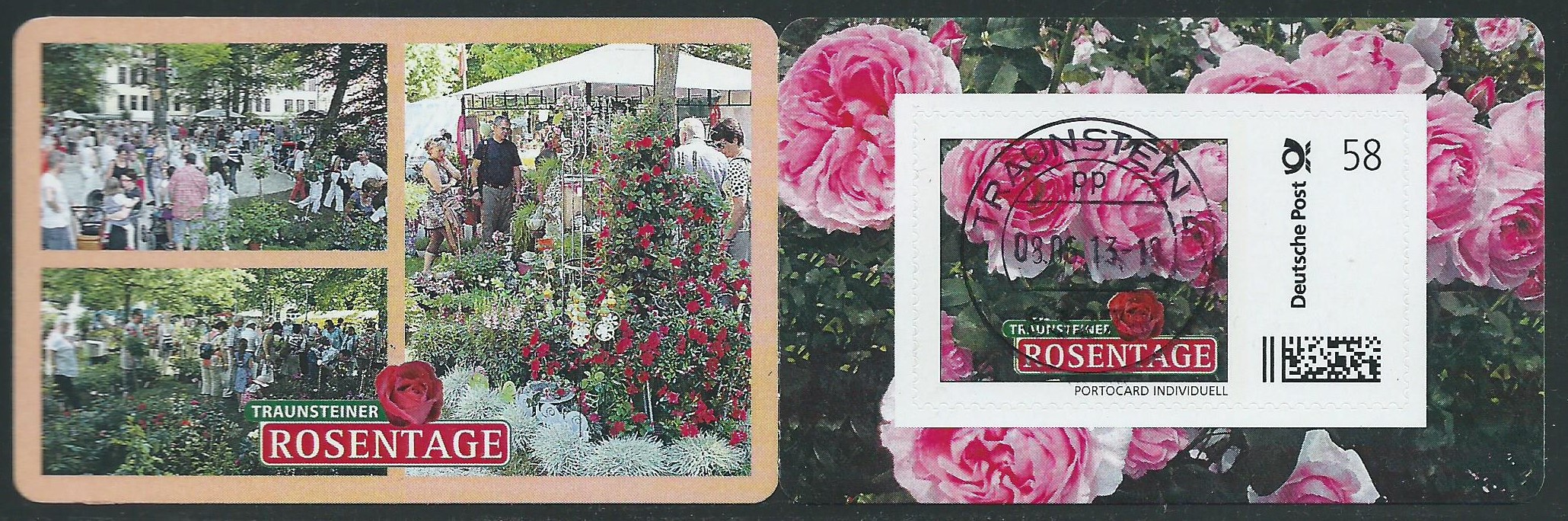 Da ich gerade Traunstein am Wickel hatte, noch eine Portocard hinterher: Hier eine Portocard mit der Motivausgabe "Traunsteiner Rosentage". Wertstufe dieses Mal 58 ct, gestempelt in Traunstein am 8.6.13. Diese Sammelstücke hatte mir ein dort wohnender Sammlerfreund dankenswerter Weise zukommen lassen.