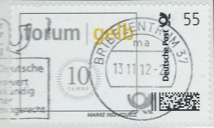 Und noch eine 55 ct Marke: "10 Jahre forum / gelb", gestempelt Briefzentrum 37 am 13.11.12.