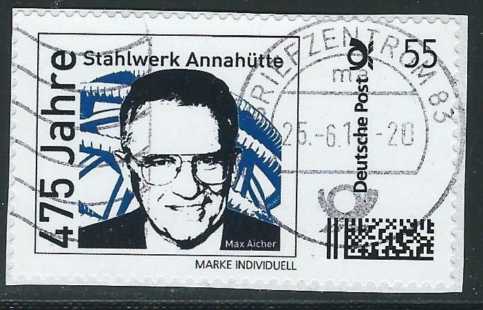 Und hier die Stahl-Industrie: 475 Jahre Stahlwerk Annahütte zu 55 ct, gestempelt am 25.6.12 im Briefzentrum 83
