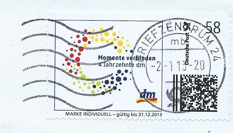Zur Abwechslung mal eine Marke zu 58 ct. Und das ist eine ganz besondere. Auftraggeber war die Firma "dm", eine Drogeriemarktkette. Hier wurde an die Kunden mit Kundenkarte eine Portocard mit einer Marke verschenkt. Aber: Das besondere hieran ist, sie war nur vom Ausgabetag (Anfang 2013) bis zum 31.12.2013 gültig! Das wurde auch im unteren Rand vermerkt. Hintergrund ist gewesen, dass zu dem Zeitpunkt mit der Post abgerechnet werden sollte, wie viele Marken wirklich verbraucht wurden und die Portoleistung dann zwecks der aufgedruckten Matrix berechnet werden konnte. Meines Wissen ist bzw. war das bislang die einzige Marke Individuell, die eine begrenzte Gültiogkeit hatte. Hier die Marke im Bild:
