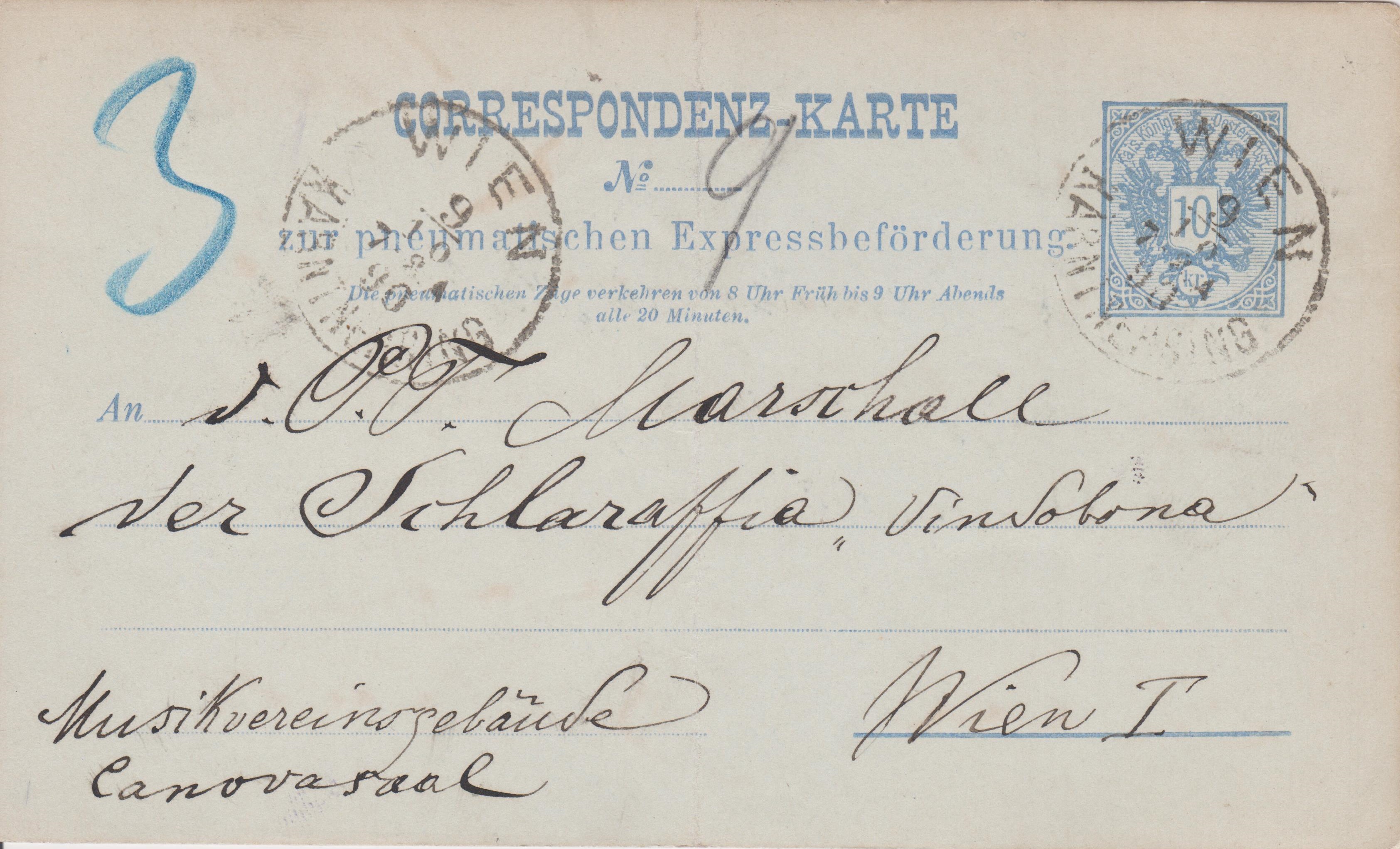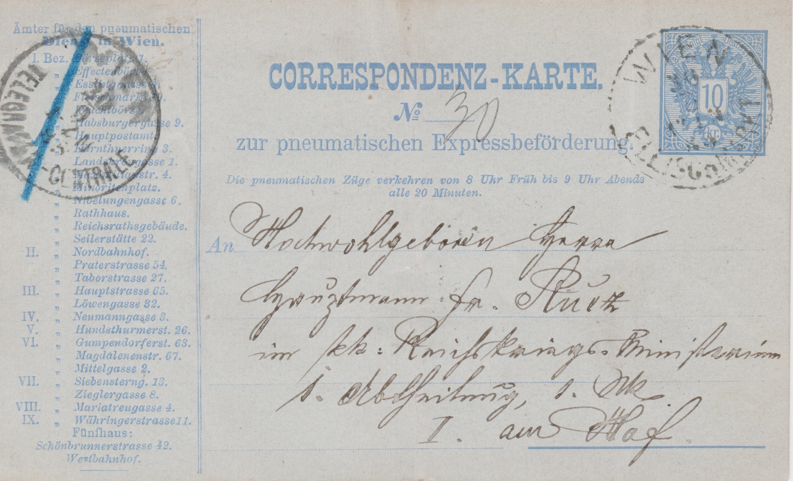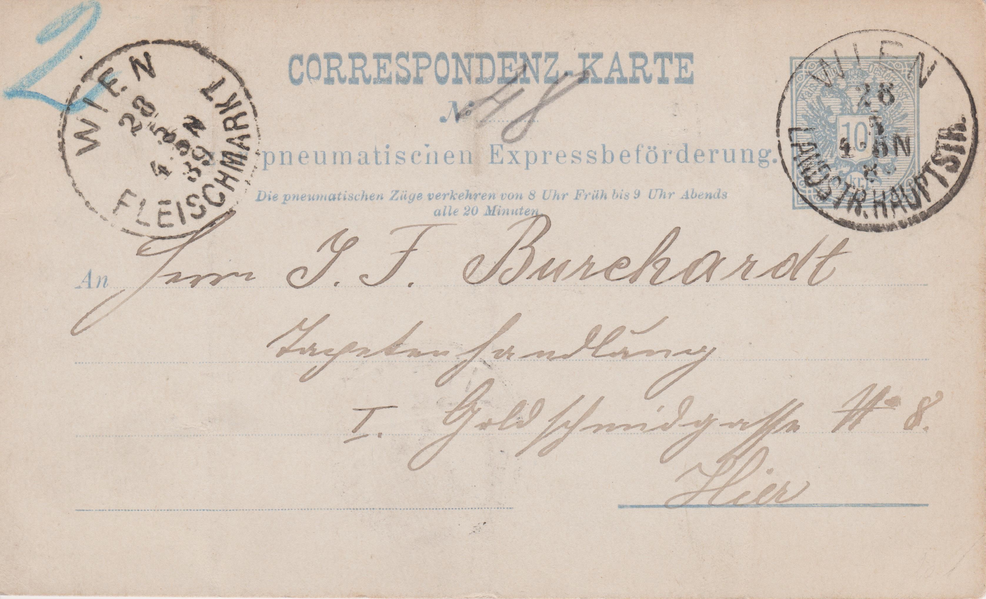 Diese Rohrpostkarte wurde mit der Wiener Rohrpost nach "45" = WIEN 45 befördert: