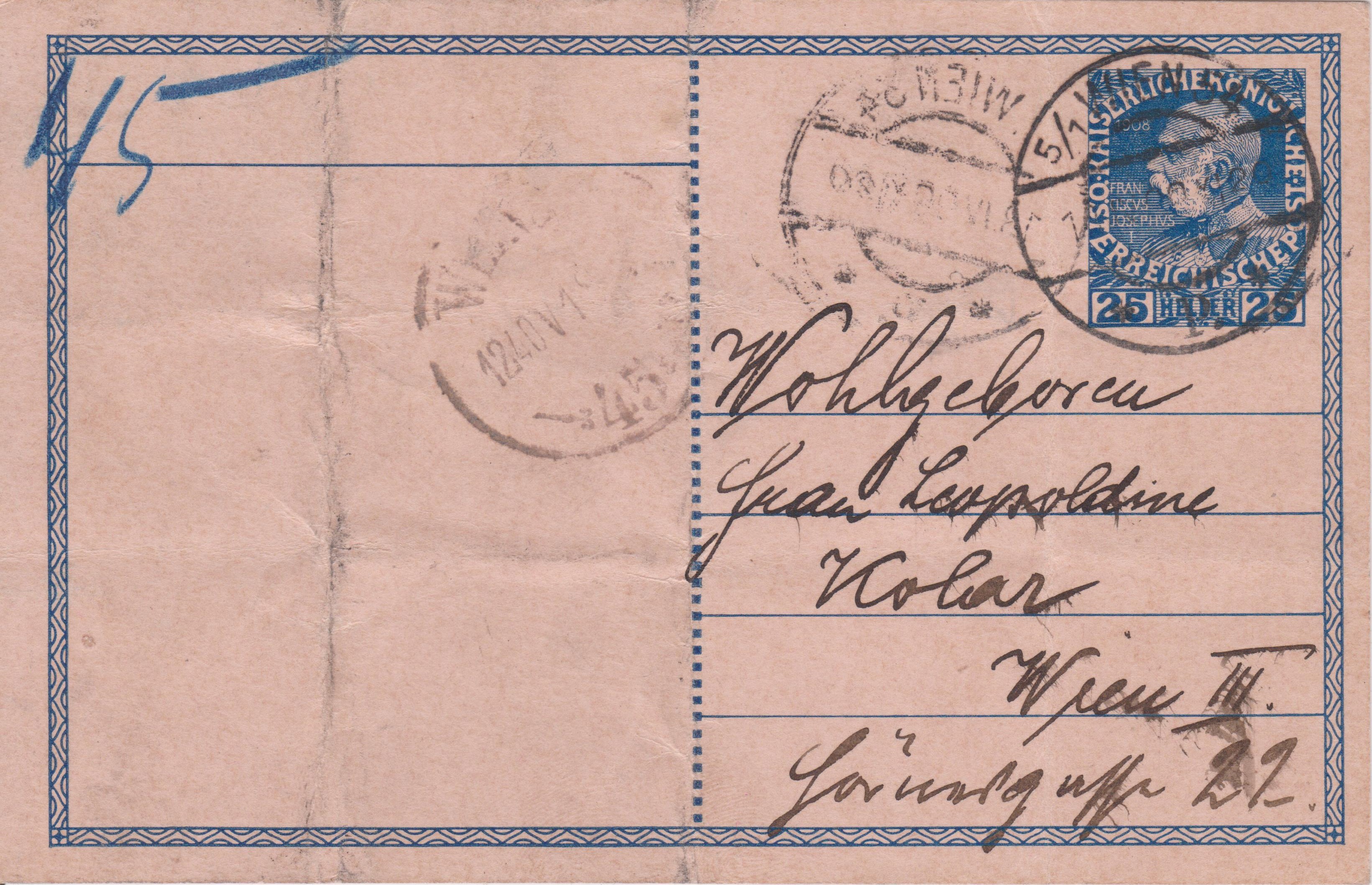 Die nach "Wien III." adressierte Sendung wurde per Rohrpost nach "45" wie per Blaustift vermerkt geleitet und kam laut Tagesstempel in WIEN 45 an.