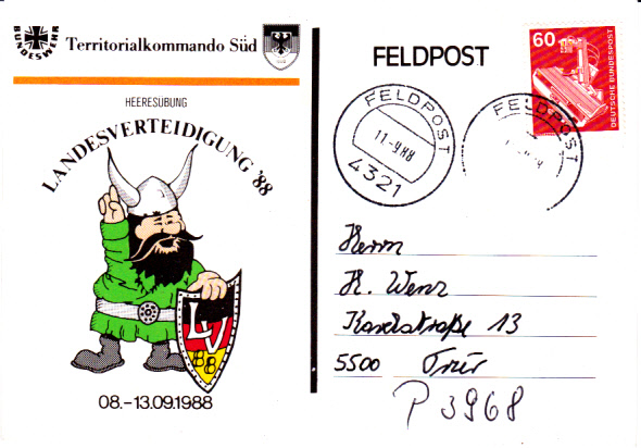 Diese Postkarte wurde am 03.10.1993 in Somalia von einem Soldaten des deutschen Heereskontingentes aufgegeben und mit einem Tagesstempel "FELDPOST 5200 a" im deutschen Feldpostamt in Belet Uen entwertet: