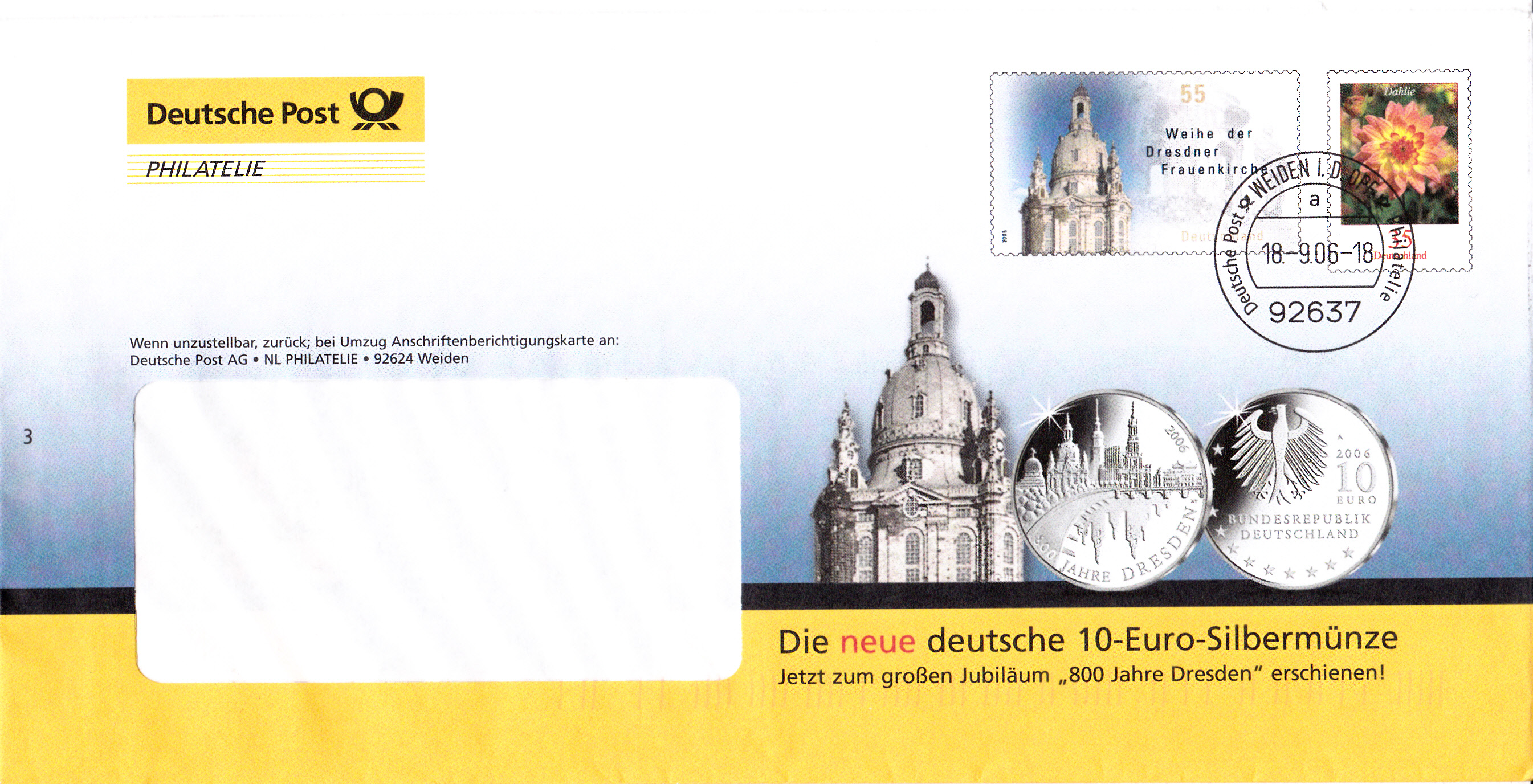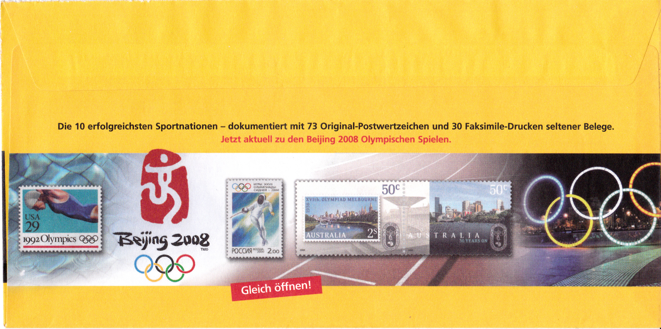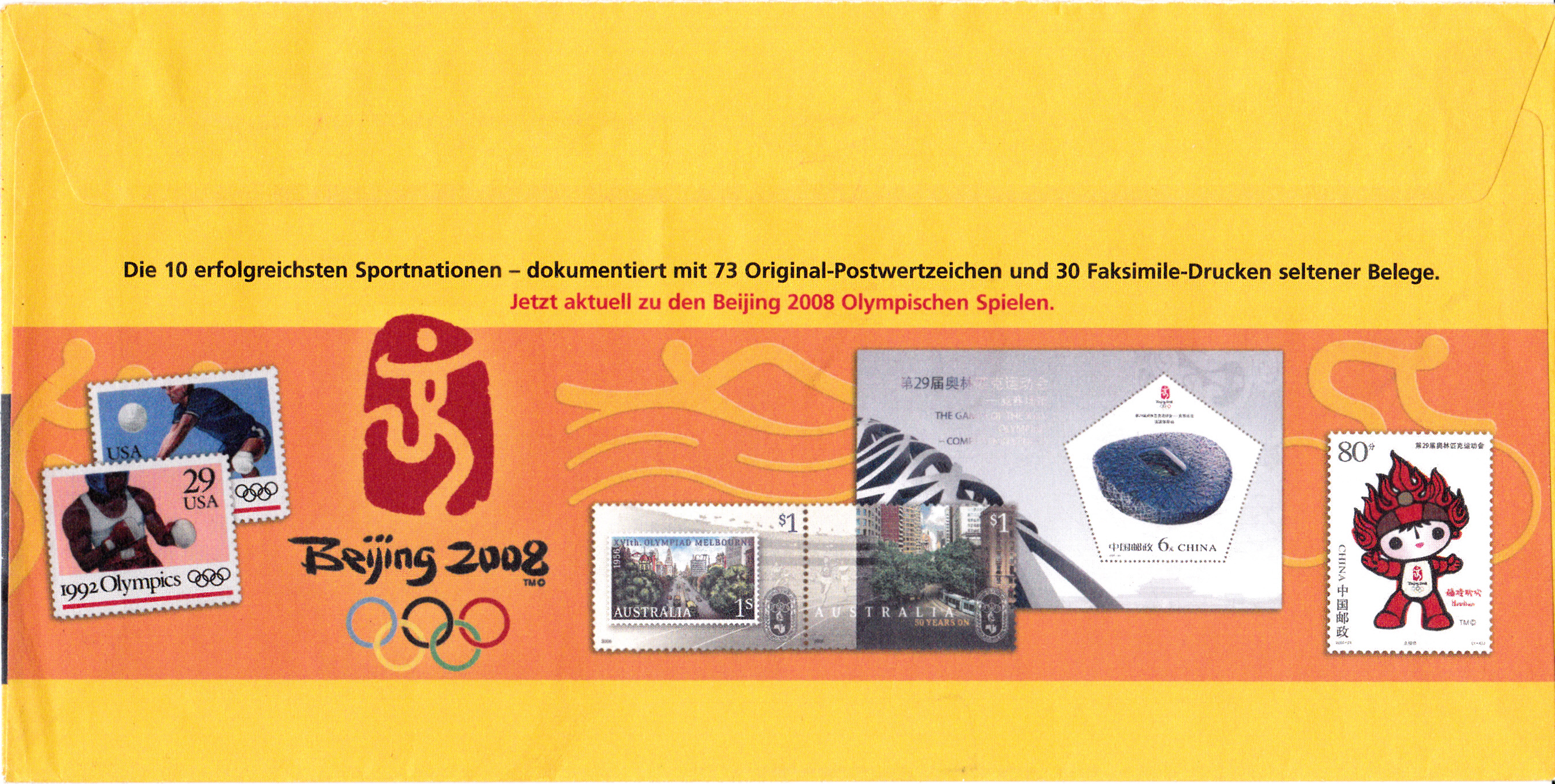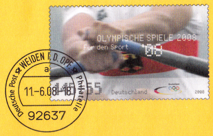 Hier noch ein weiterer Ganzsachenumschlag (MiNr EA F329) im Format 229x114 mm mit einem Wertstempel der 145+55 Cent-Marke "Olympische Spiele 2008, Rudern" (MiNr 2652) aus der Serie für die Sporthilfe 2008. Die Vorausentwertung trägt das Datum "11.-6.08".