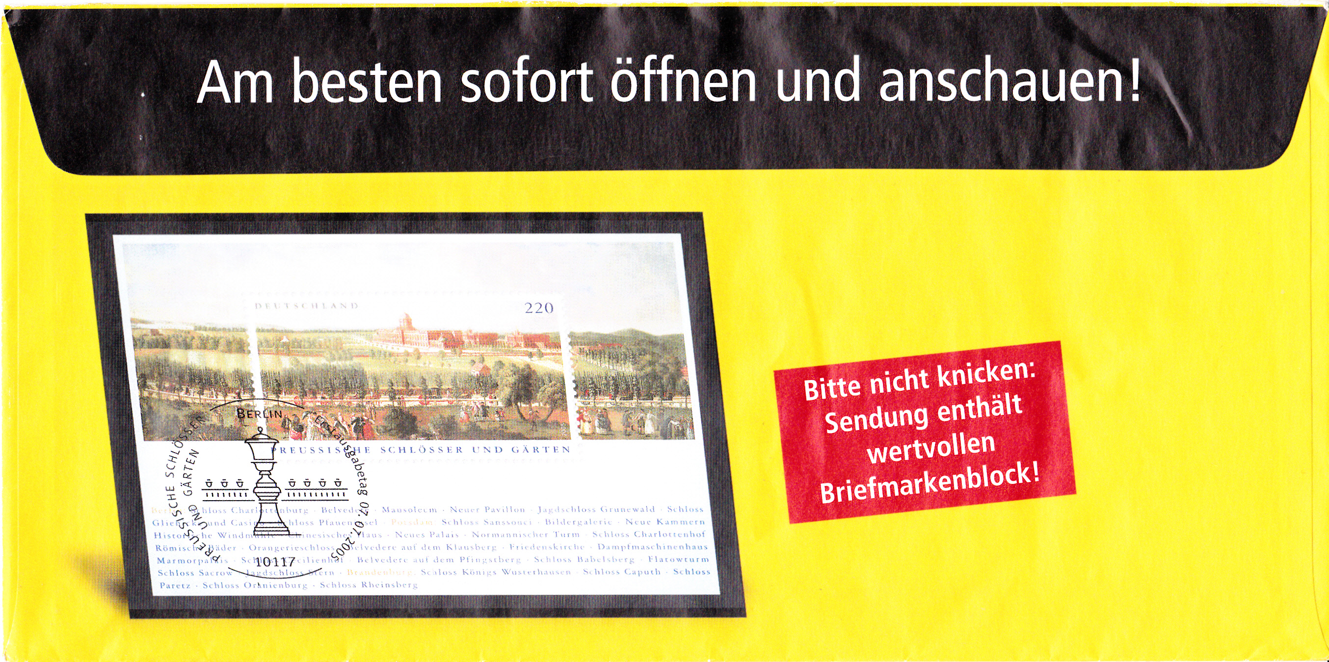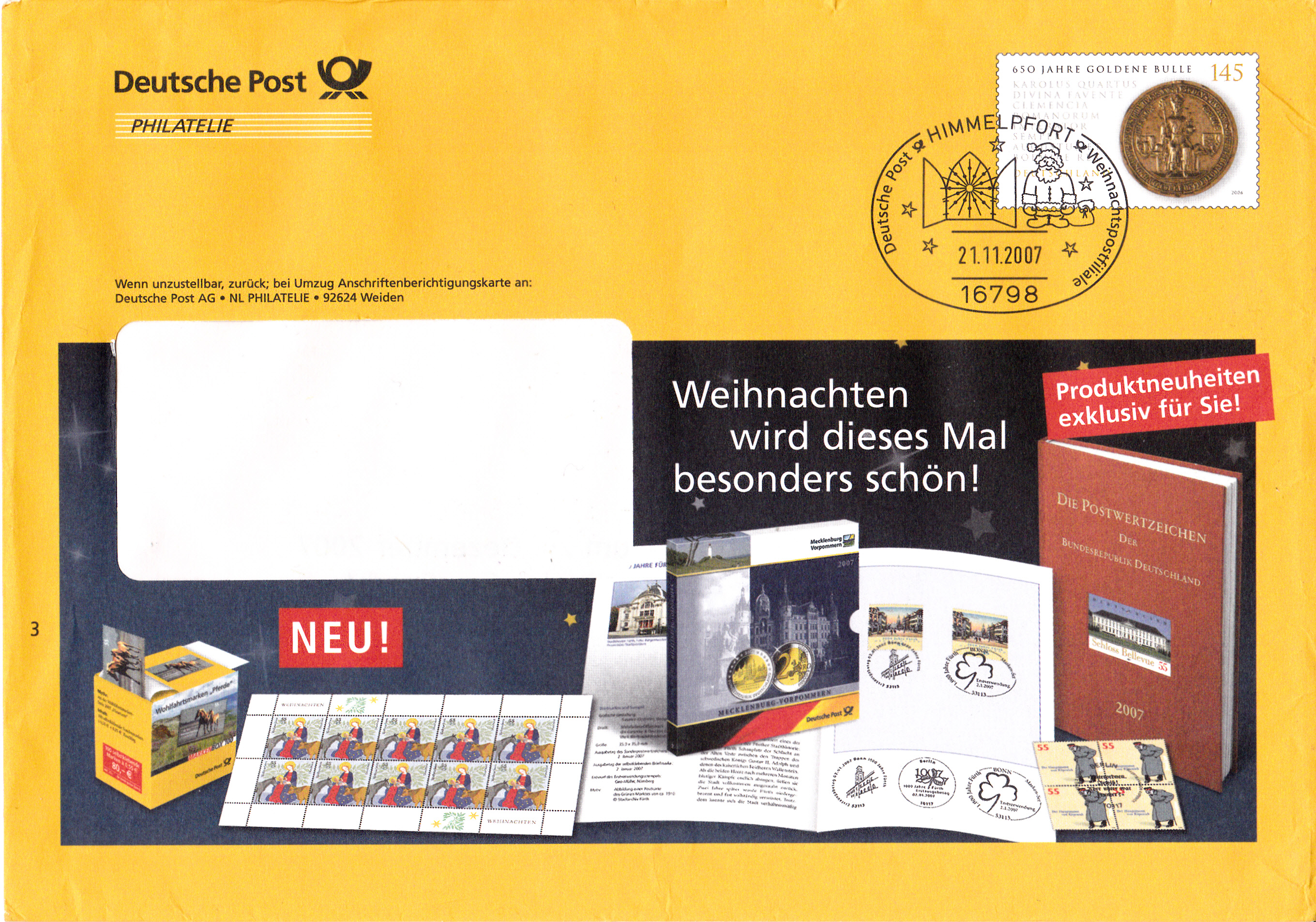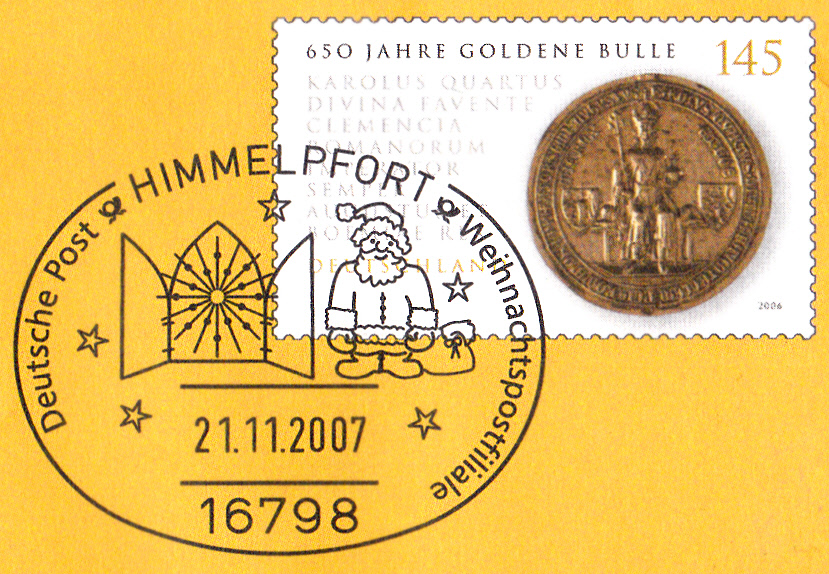 Dieser Ganzsachenumschlag im Format 229 x 162 mm hat einen Wertstempel mit der Marke zu 145 Cent "450 Jahre Goldene Bulle" (MiNr 2511). Die Vorausentwertung mit einem Sonderstempel aus Himmelpfort hat das Datum "21.11.2007". Der Umschlag ist unter der MiNr EA F262 katalogisiert.