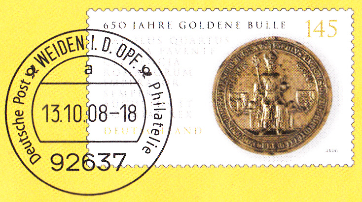 Dieser Ganzsachenumschlag im Format 229 x 162 mm hat einen Wertstempel mit der Marke zu 145 Cent "450 Jahre Goldene Bulle" (MiNr 2511). Die Vorausentwertung hat das Datum "13.10.08-18". Der Umschlag ist unter der MiNr EA F370katalogisiert.