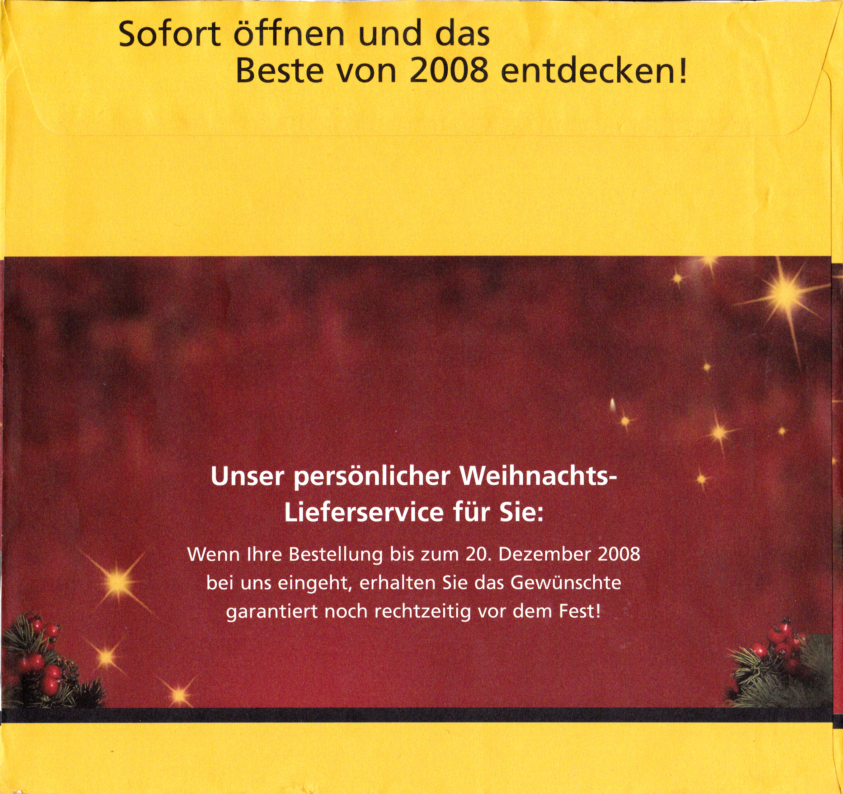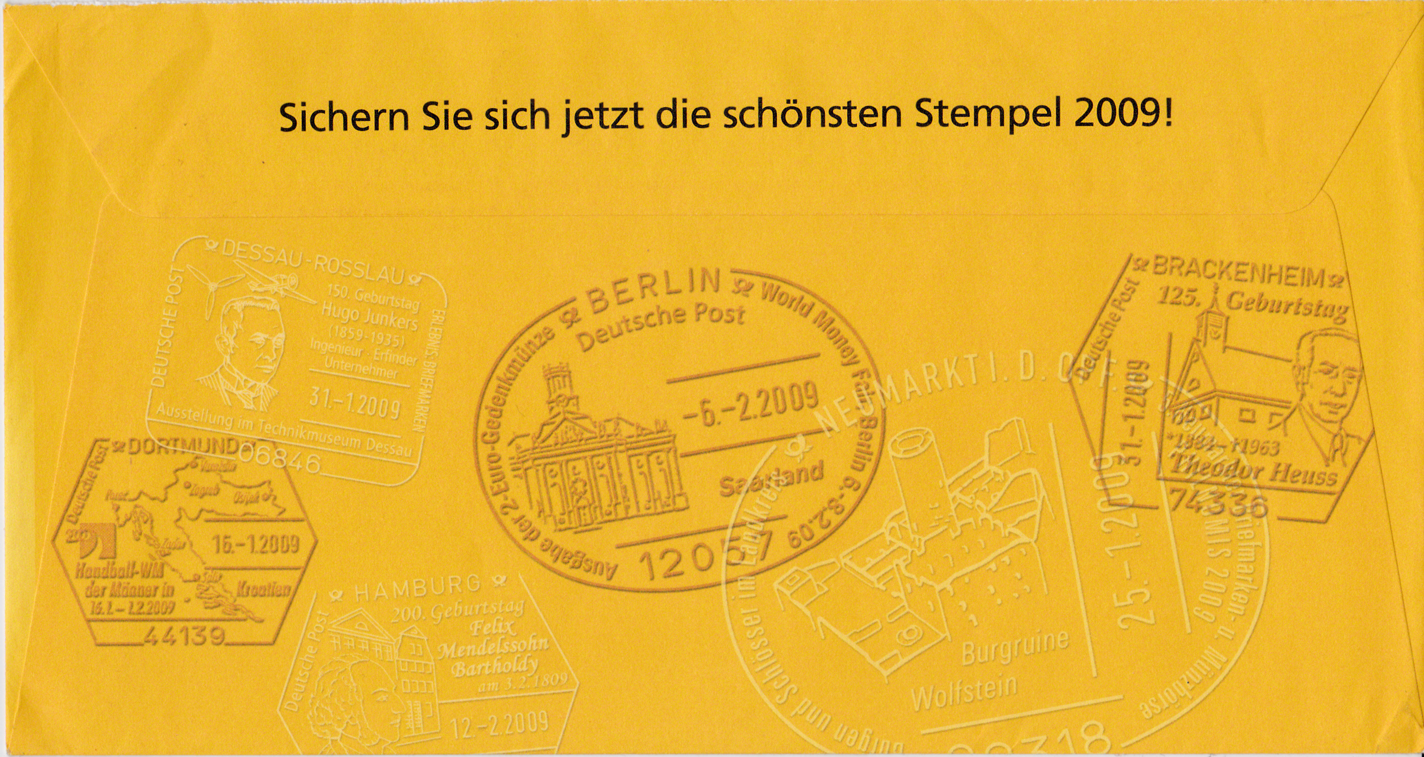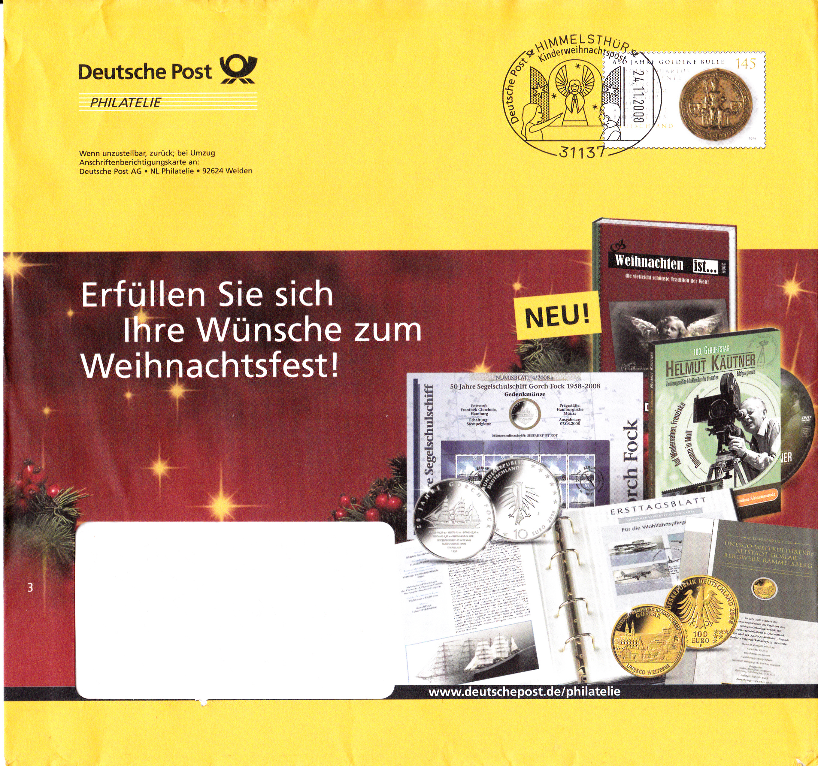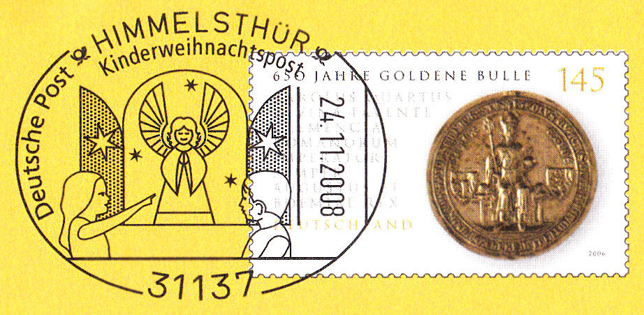 Dieser Ganzsachenumschlag im Format 230 x 220 mm hat einen Wertstempel mit der Marke zu 145 Cent "450 Jahre Goldene Bulle" (MiNr 2511). Die Vorausentwertung mit einem Sonderstempel aus Himmelthür hat das Datum "24.11.2008". Der Umschlag ist unter der MiNr EA F384 katalogisiert.