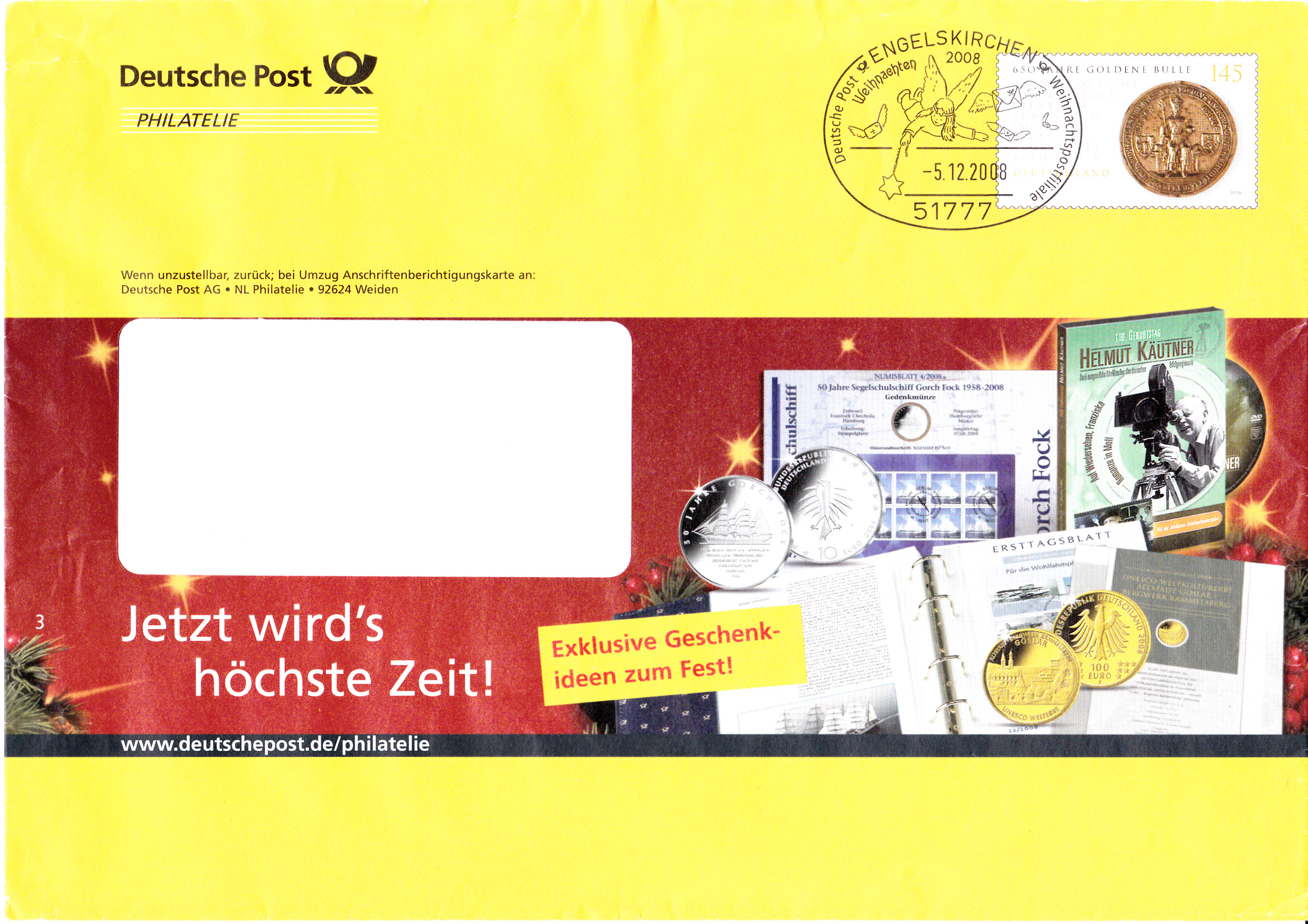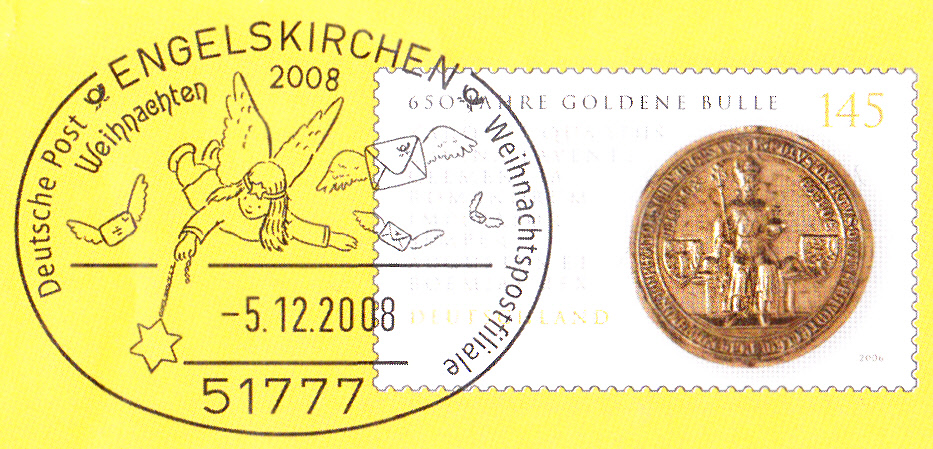 Dieser Ganzsachenumschlag im Format 229 x 162 mm hat einen Wertstempel mit der Marke zu 145 Cent "450 Jahre Goldene Bulle" (MiNr 2511). Die Vorausentwertung mit einem Sonderstempel aus Engelskirchen hat das Datum "-5.12.2008". Der Umschlag ist unter der MiNr EA F386 katalogisiert.