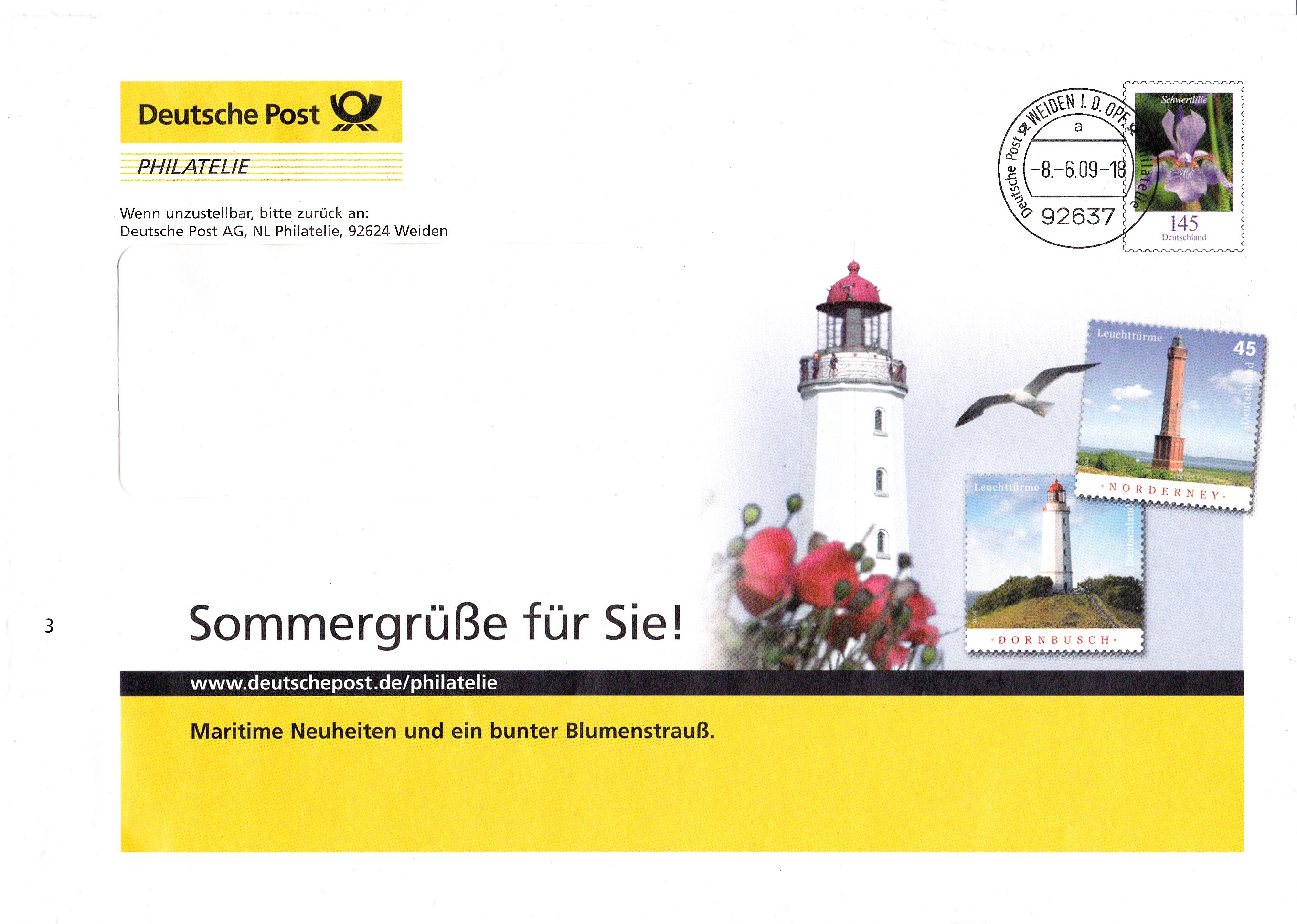 Dieser Ganzsachenumschlag im Format 229 x 162 mm hat einen Wertstempel (MiNr EA F436) mit der 145 Cent Marke "Schwertlilie" aus der Bauerserie "Blumen". Die Vorausentwertung hat das Datum "-8.-6.09-18".