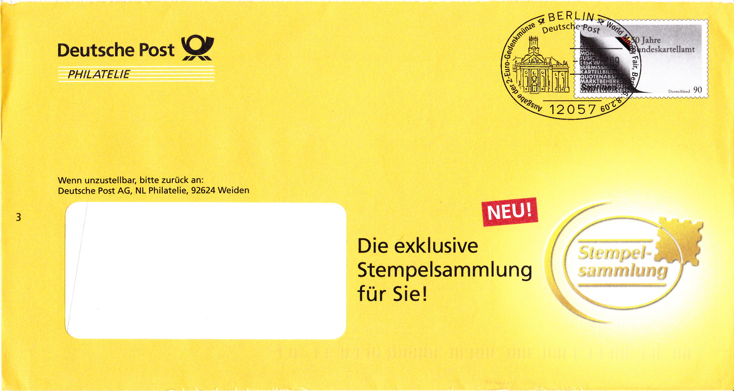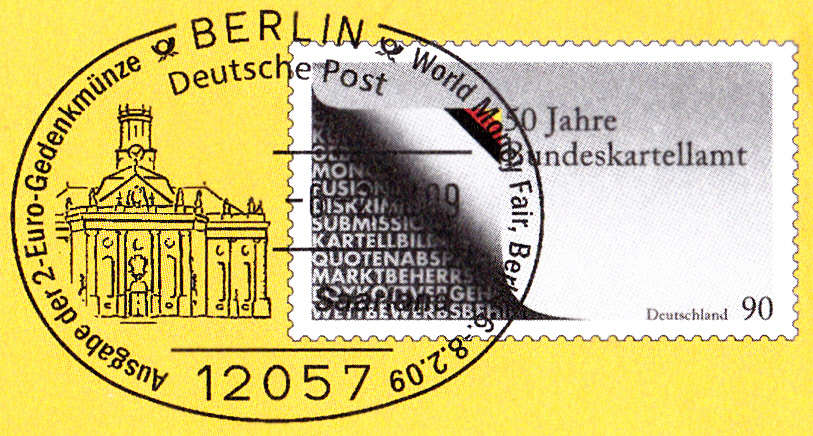 Dieser Ganzsachenumschlag im Format 235 x 125 mm hat einen Wertstempel (MiNr EA F403) mit der 90 Cent Marke "50 Jahre Bundeskartellamt" (MiNr 2641). Die Vorausentwertung hat das Datum "-6.-2.09-18".