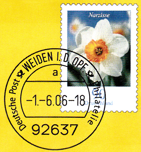 Dieser Ganzsachenumschlag (MiNr EA F142) im Format 229x114 mm hat einen Wertstempel mit der 90 Cent-Marke der Dauerserie "Blumen" (Narzisse, MiNr 2506). Die Vorausentwertung trägt das Datum "-1.-6.06".