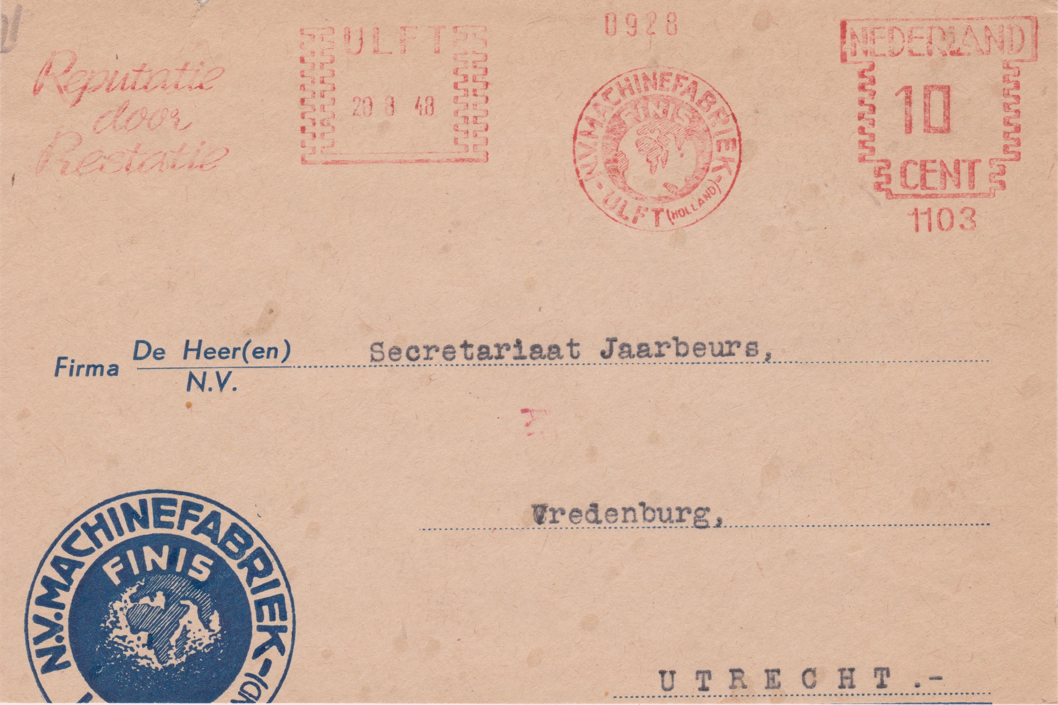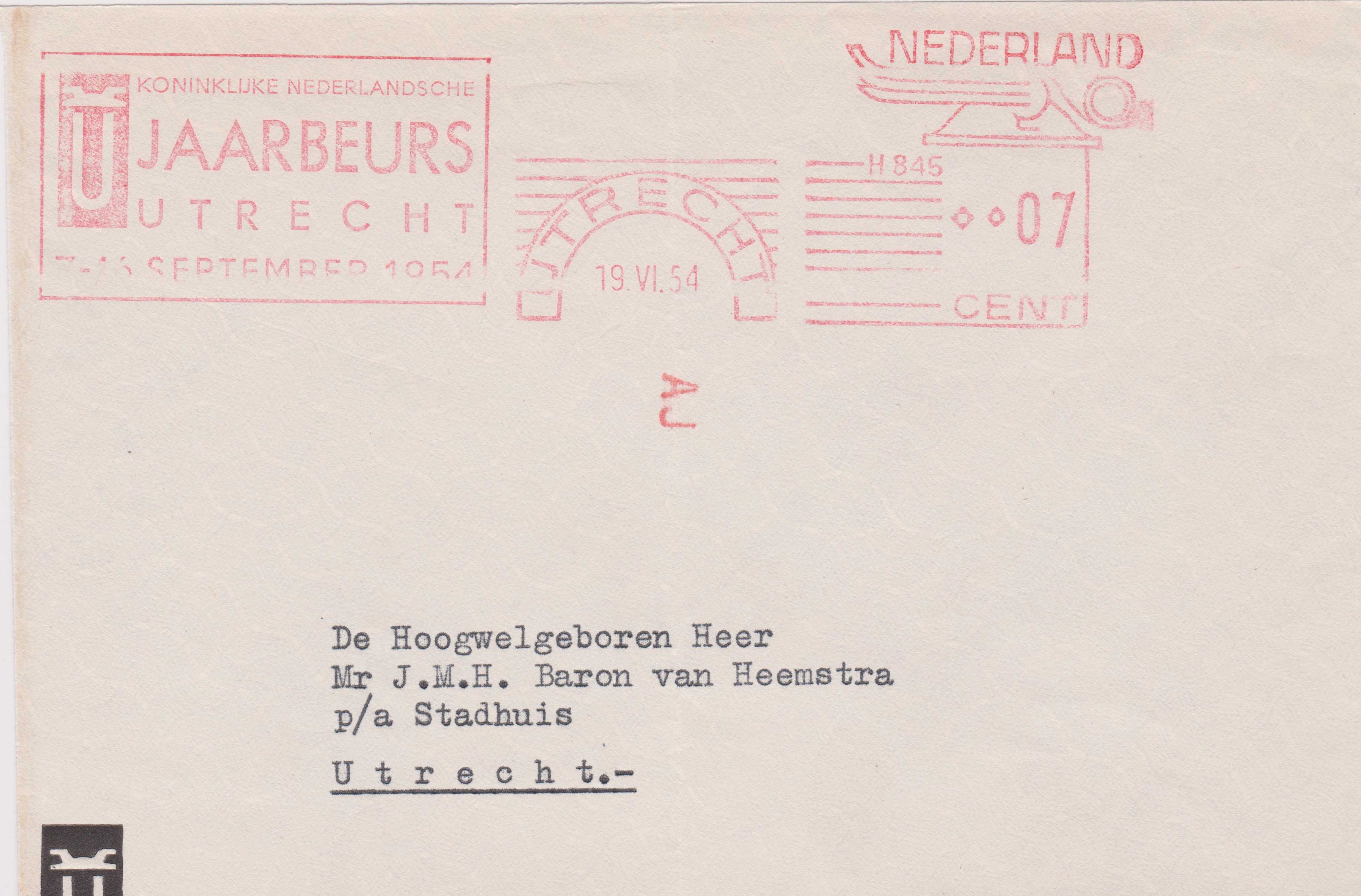 Dieser am 19.06.1954 in UTRECHT aufgegebene Beleg erhielt in Utrecht eine Codierung "AJ" per Transorma: