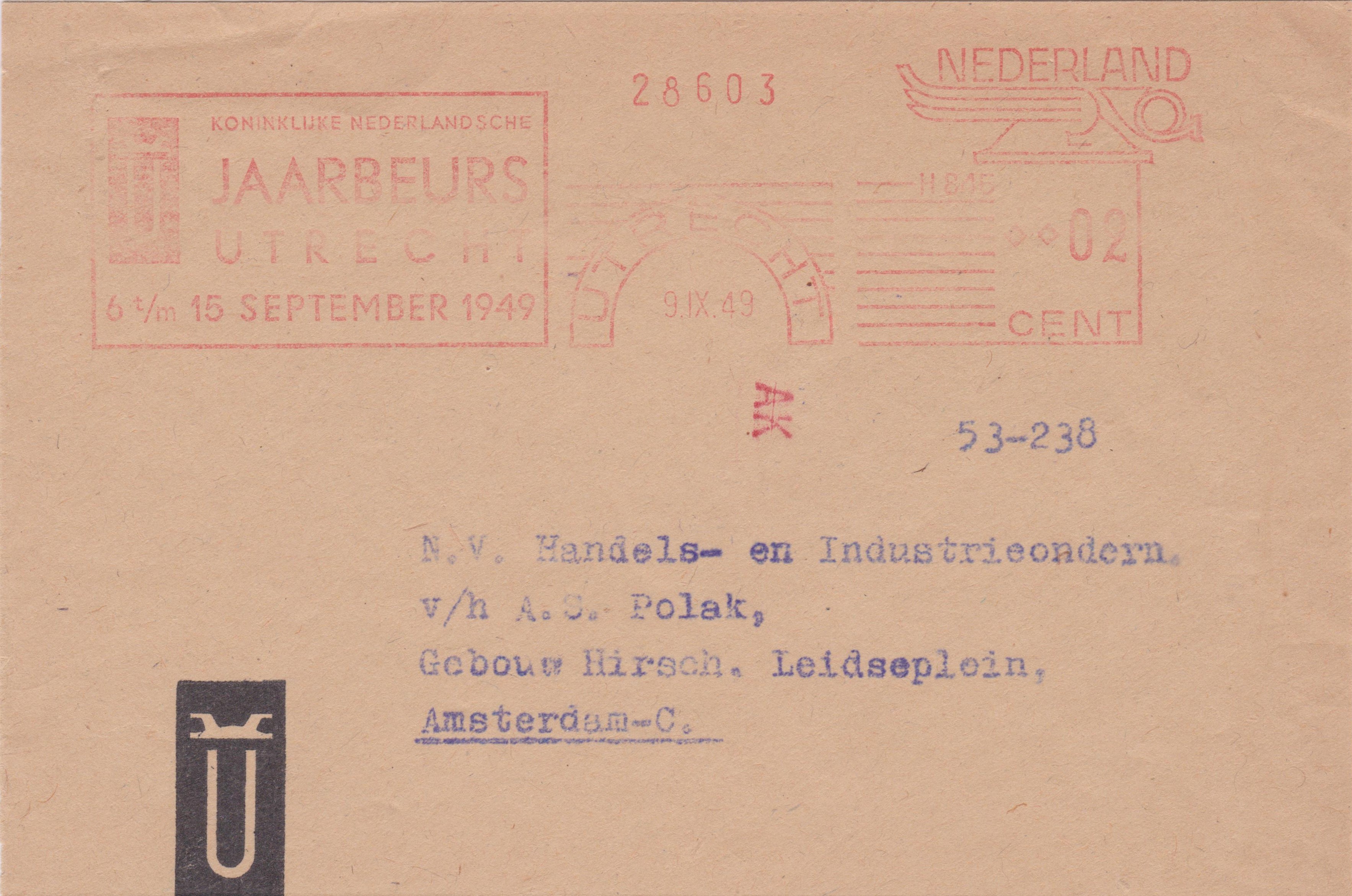 Dieser am 11.10.1949 in UTRECHT aufgegebene Beleg nach Amsterdam erhielt in Utrecht eine Ausgangscodierung "AI" per Transorma: