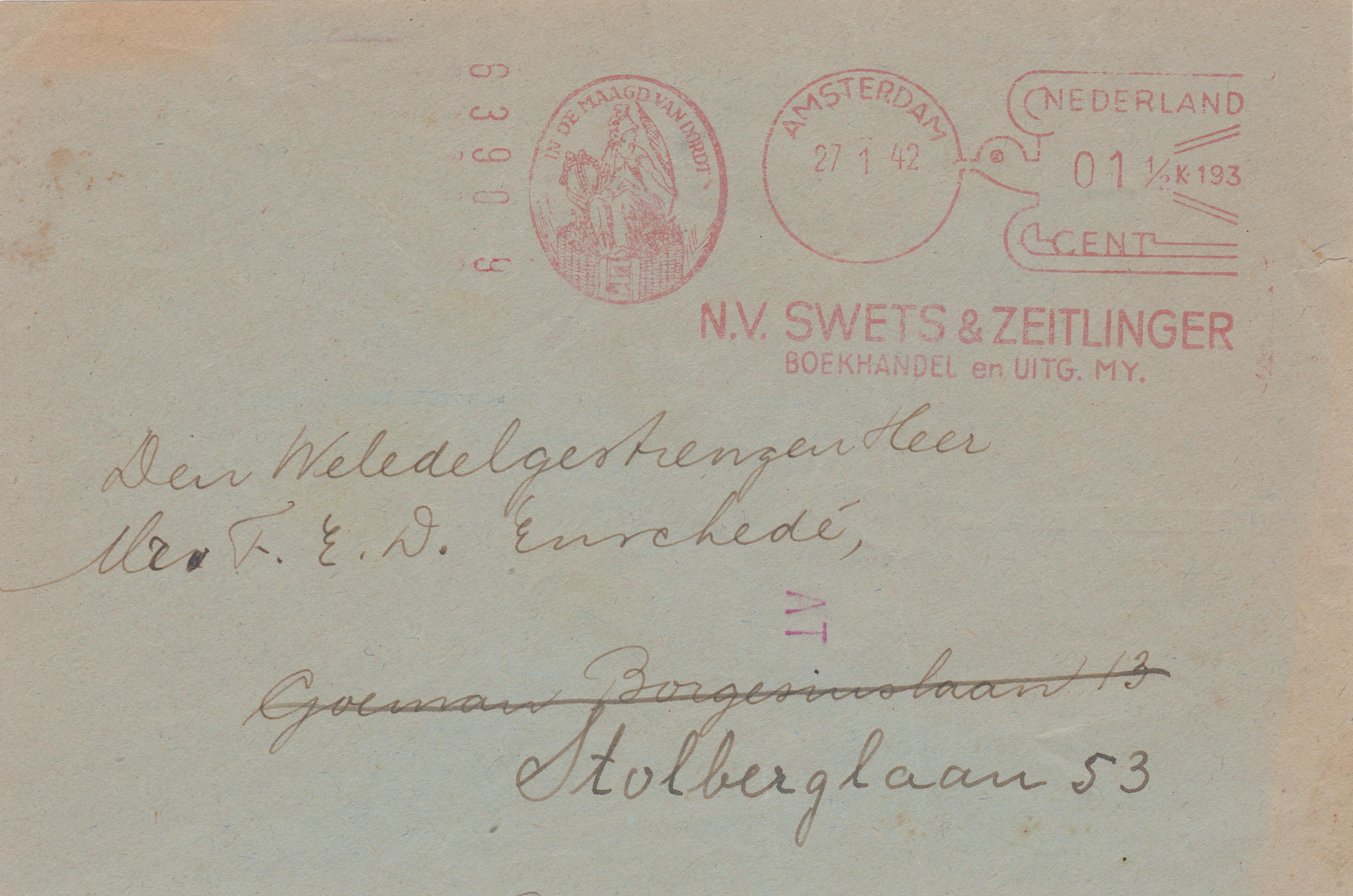 Dieser am 27.01.1942 in AMSTERDAM aufgegebene Beleg erhielt in Utrecht eine Eingangscodierung "AT" per Transorma: