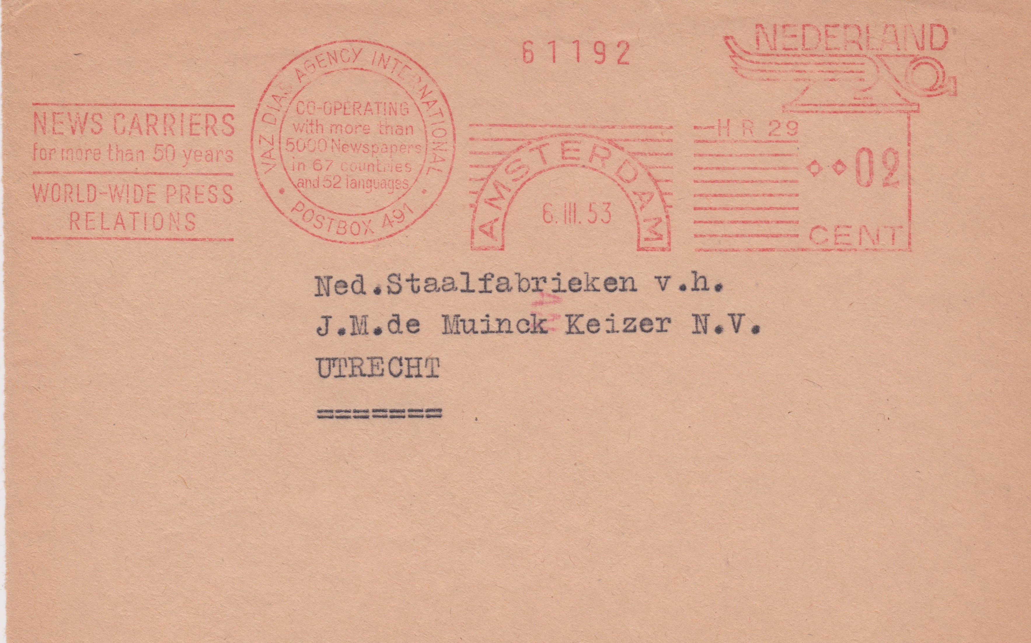Dieser am 06.03.1953 in AMSTERDAM aufgegebene Beleg erhielt in Utrecht eine Eingangscodierung "AN" per Transorma: