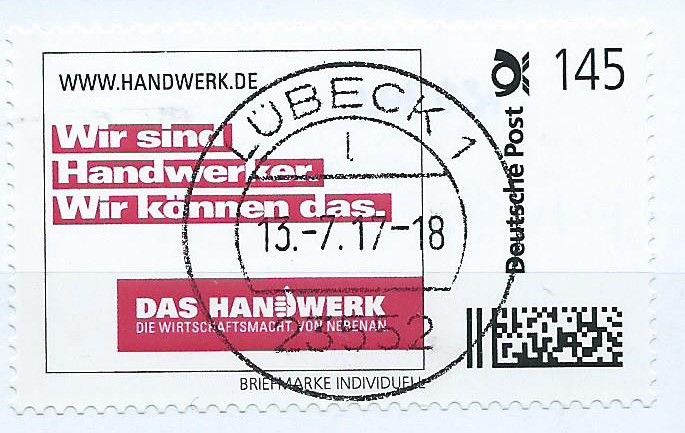 Als Abschluss noch eine 145 ct auf weissem Untergrund: „Wir sind Handwerker, wir können das“ mit Stempel Lübeck vom 13.7.17