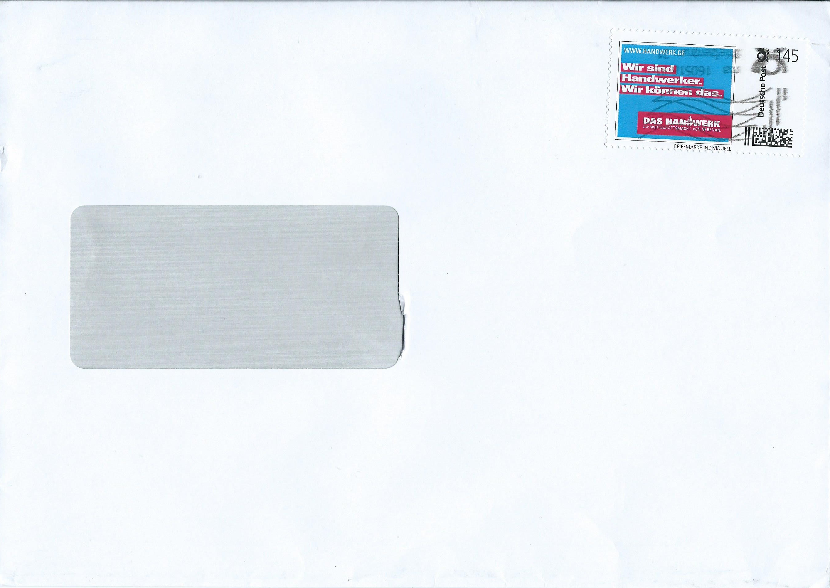 einmal ein Neuzugang der Marke Individuell aus der Handwerk-Serie: Ein Grossbrief zu 1,45 € mit dem Text „Wir sind Handwerker, wir können das. Gestempelt wurde mit Tintenstrahlentwertung am 16.5.18 im Briefzentrum 21.