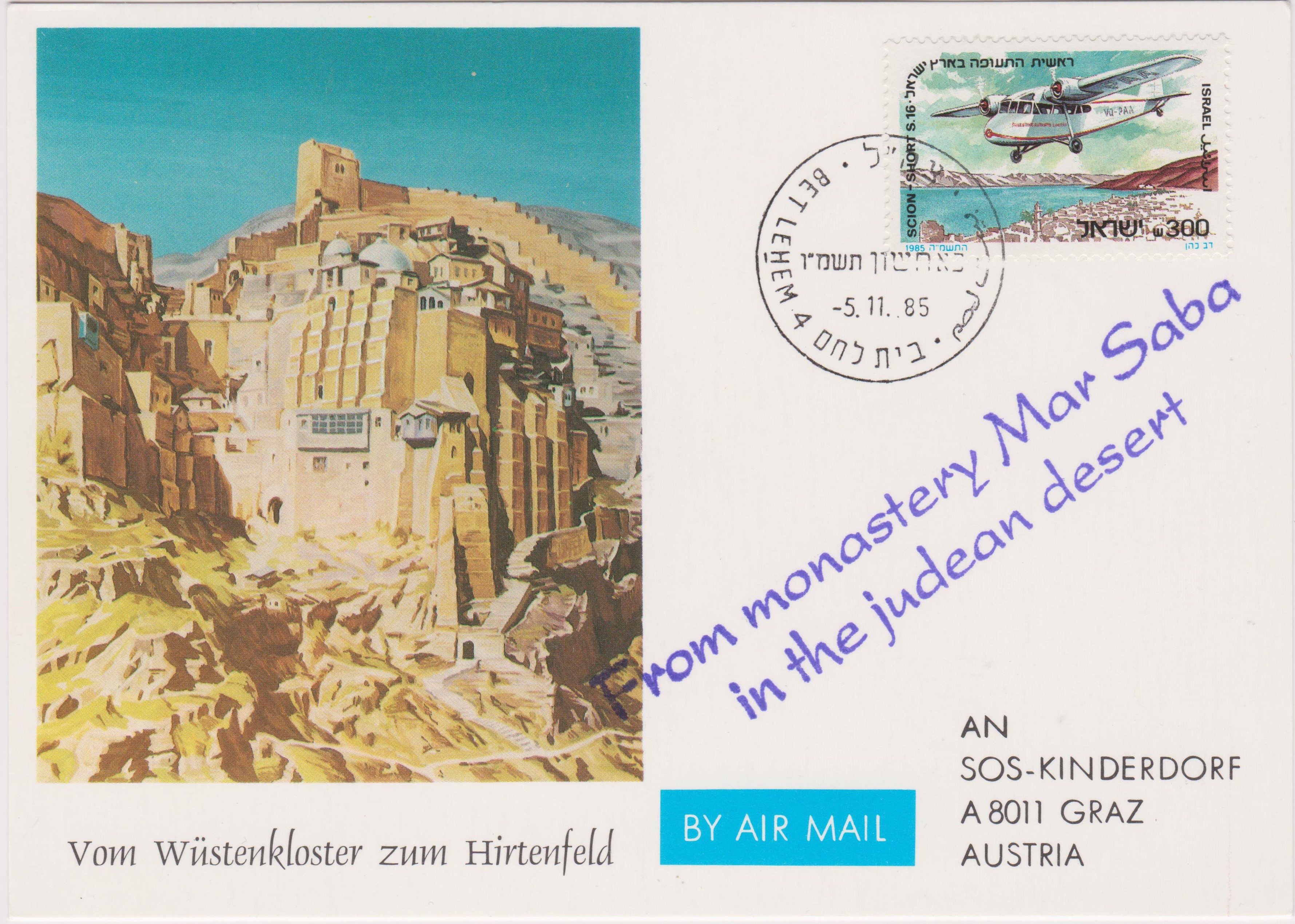 Diese Postkarte, adressiert an die Organisation SOS-KINDERDORF in Graz, wurde am 05.11.1985 in Bethlehem in Israel aufgegeben: