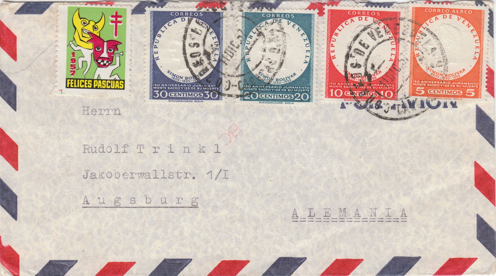 Dieser nach Augsburg adressierte Luftpostbrief wurde am 11.12.1957 in Caracas aufgegeben und lief dort durch die TRANSORMA, worauf ein Operatorstempel "BC" hinweist: