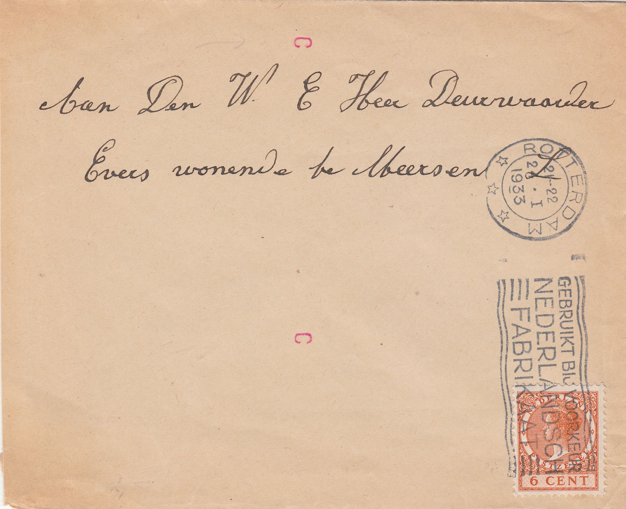 Er wurde am 24.01.1933 in Rotterdam aufgegeben und trägt eine senkrechte TRANSORMA-Codierung "C C".