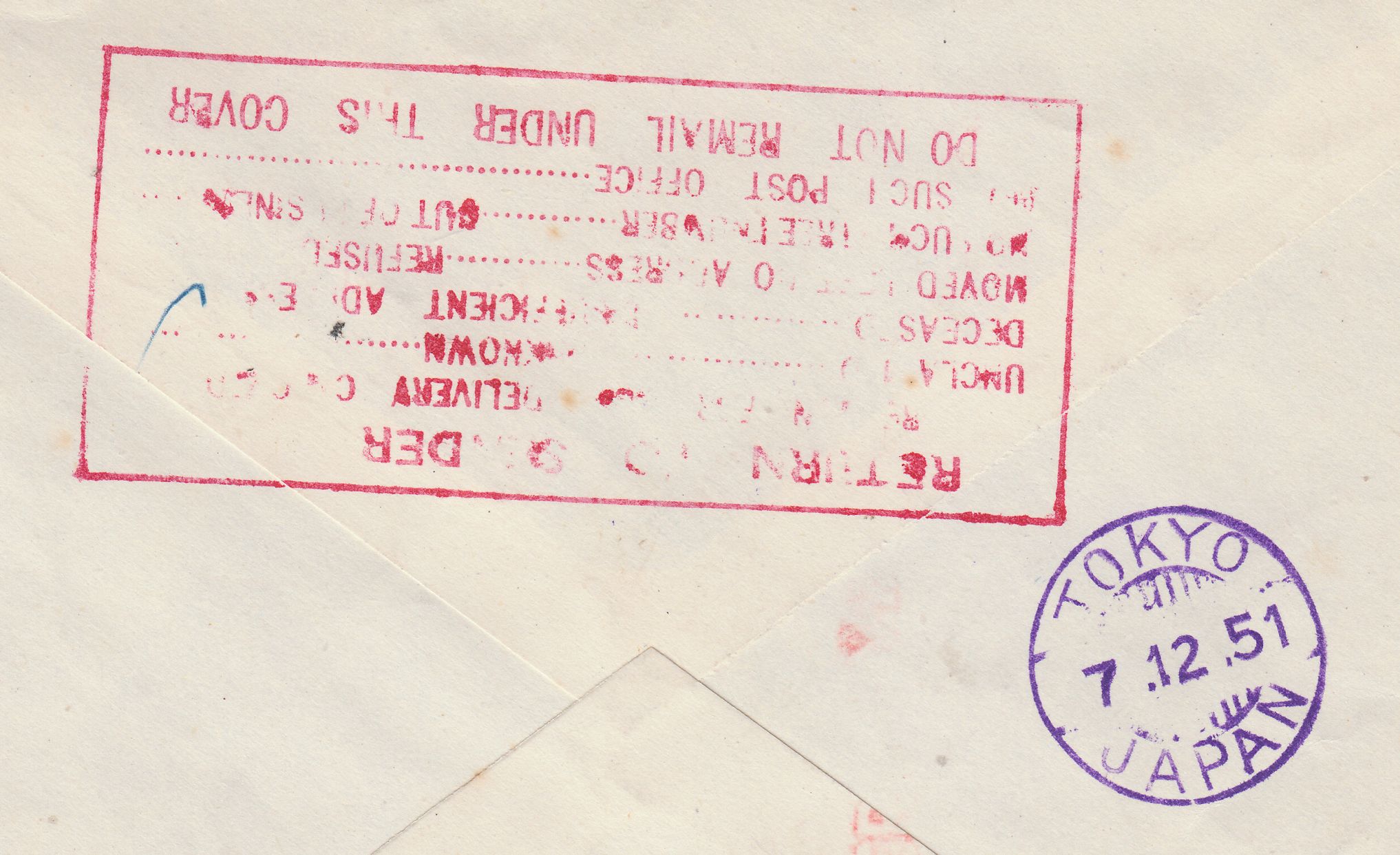Rückseitig finden sich ein Tagesstempel "TOKYO JAPAN 7.12.51" sowie ein achtzeiliger Rahmenstempel "RETURN TO SENDER".