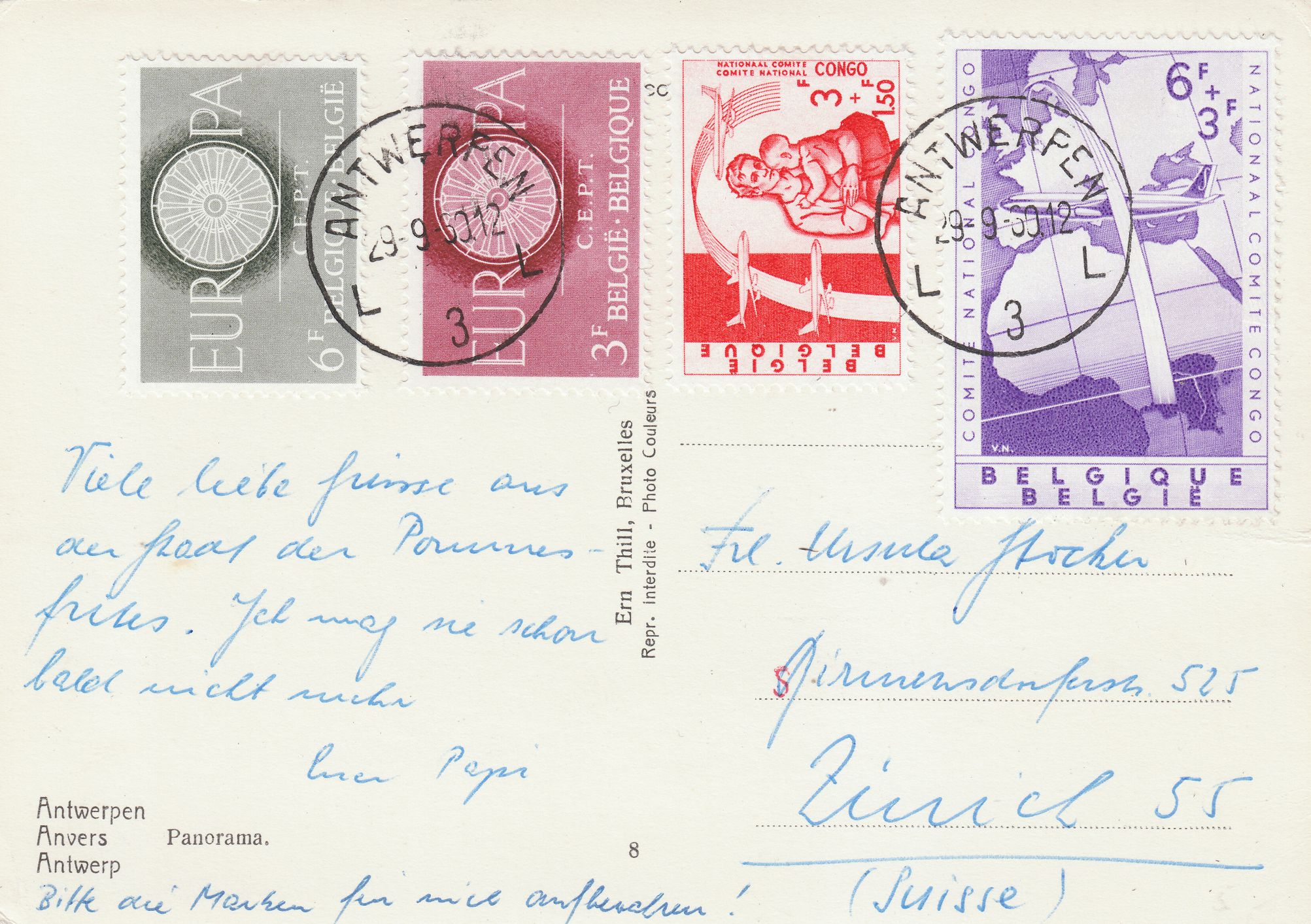 Diese nach Zürich adressierte Postkarte wurde am 29.09.1960 in Antwerpen aufgegeben und zeigt eine TRANSORMA-Codierung "S":