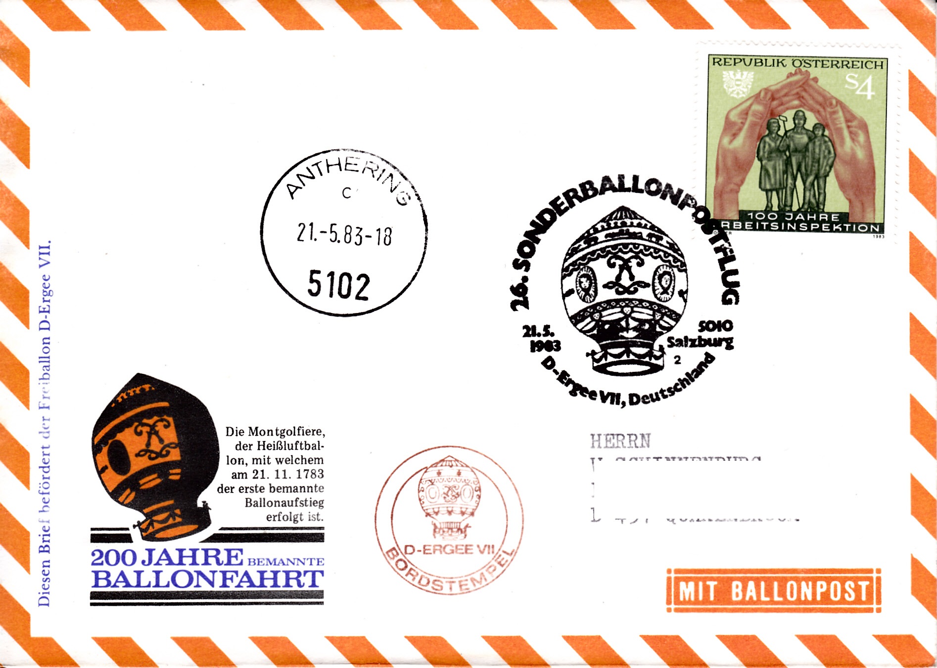 Dieser Brief wurde am 21.5.1983 in Salzburg für den 26. Sonder-Ballonpostflug der Österreichischen Pro Juventute mit dem Freiballon D-Ergee VII aufgegeben. Er erhielt den Sonderstempel mit der Kennziffer "2" aus Salzburg zu diesem Ballonflug und wurde am gleichen Tag mit dem Freiballon D-Ergee VII befördert. Er erhielt zusätzlich einen Bordstempel und einen Tagesstempel aus Anthering.