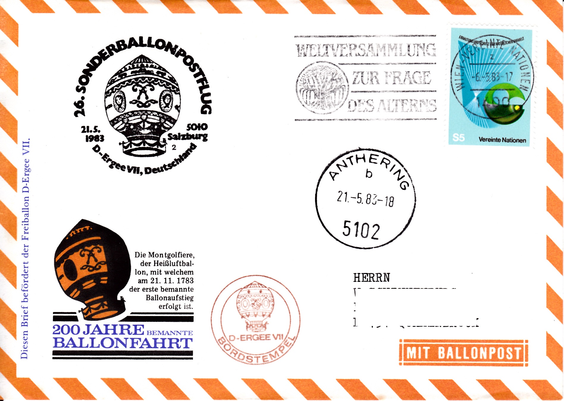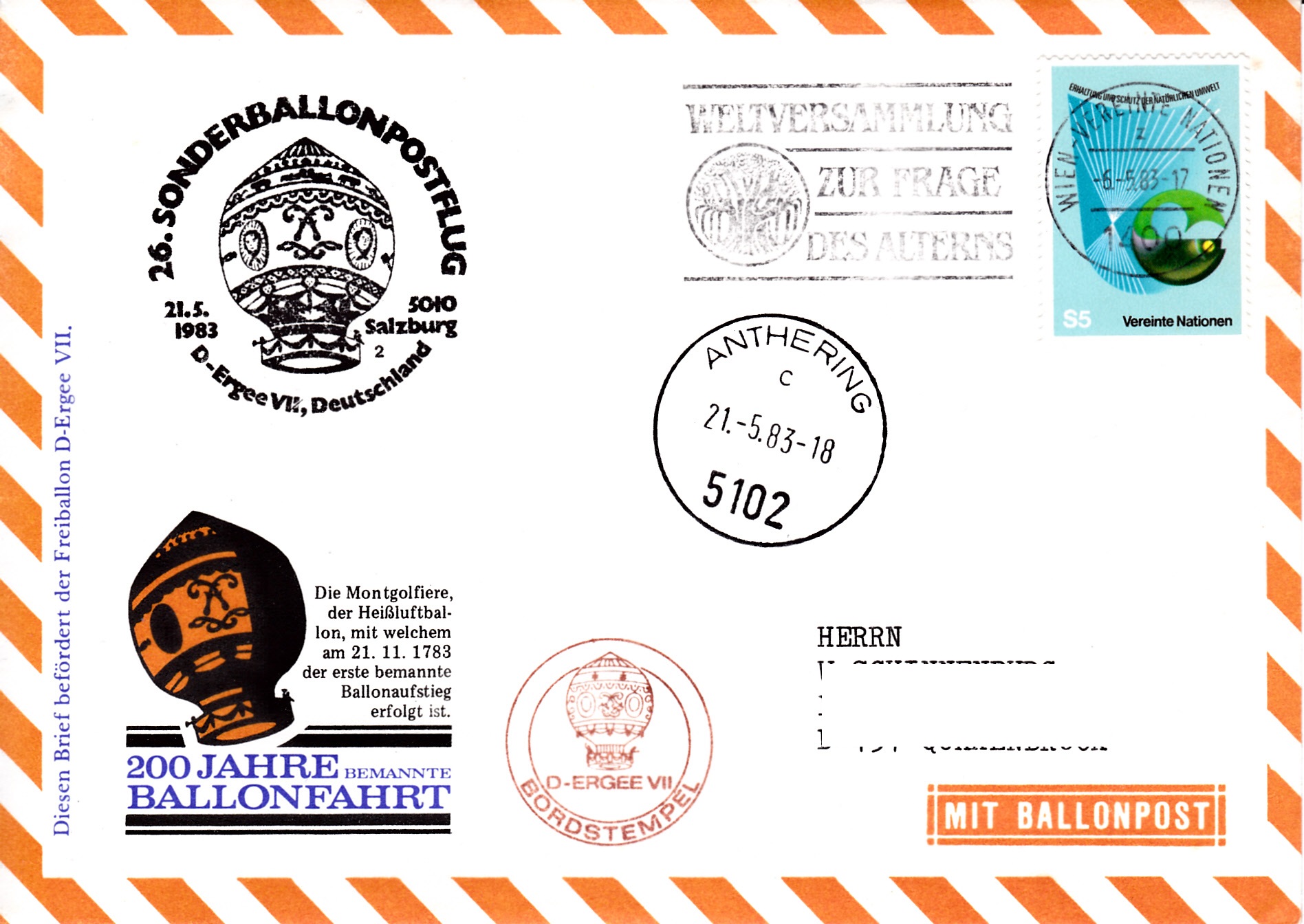 Dieser Brief wurde am 6.5.1983 bei der UN-Postverwaltung Wien für den 26. Sonder-Ballonpostflug der Österreichischen Pro Juventute mit dem Freiballon D-Ergee VII aufgegeben und mit einem Maschinenstempel Wien-Vereinte Nationen gestempelt. Am 21.5.1983 wurde er mit dem Freiballon D-Ergee VI befördert. Der Brief erhielt an diesem Tag den Sonderstempel aus Salzburg mit der Kennziffer "1" zu diesem 26. Sonder-Ballonpostflug, einen Tagesstempel aus Anthering mit dem Kennbuchstaben "b" und einen Bordstempel.