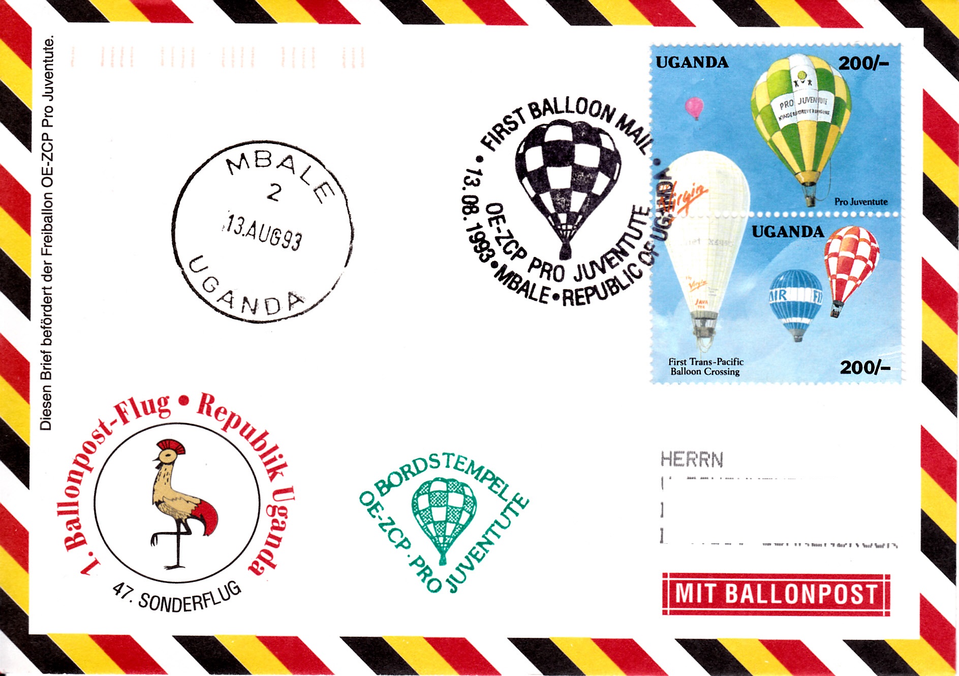 Der 1. Ballonpost-Flug in Uganda in Mbale am 13.8.1993 war auch der 47. Sonder-Ballonpostflug der Österreichischen Pro Juventute mit dem Freiballon OE-ZCP.