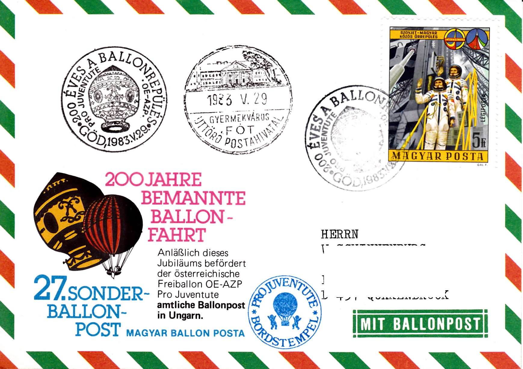Der 27. Sonder-Ballonpostflug der Österreichischen Pro Juventute mit dem Freiballon OE-AZP wurde am 29.5.1983 in Ungarn durchgeführt. Hierzu zeige ich diese Karte.
