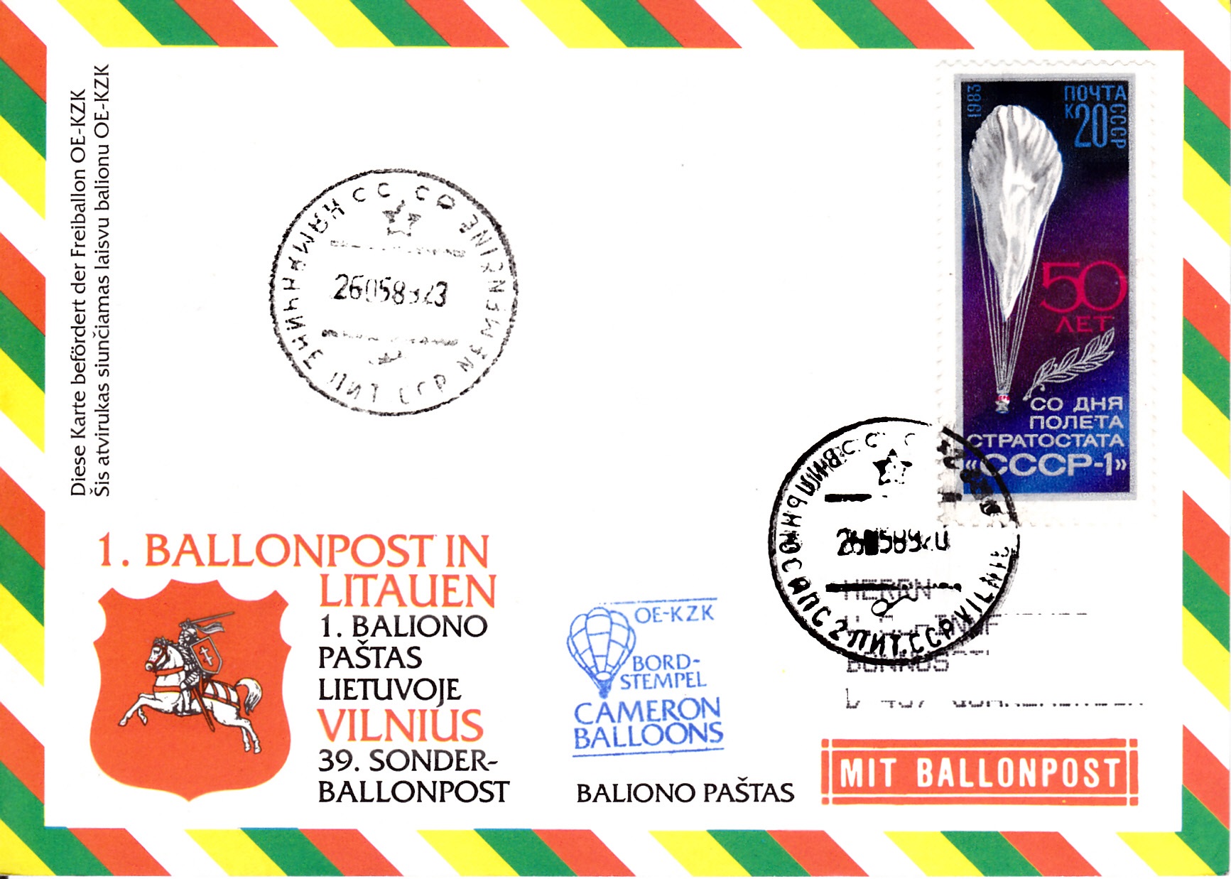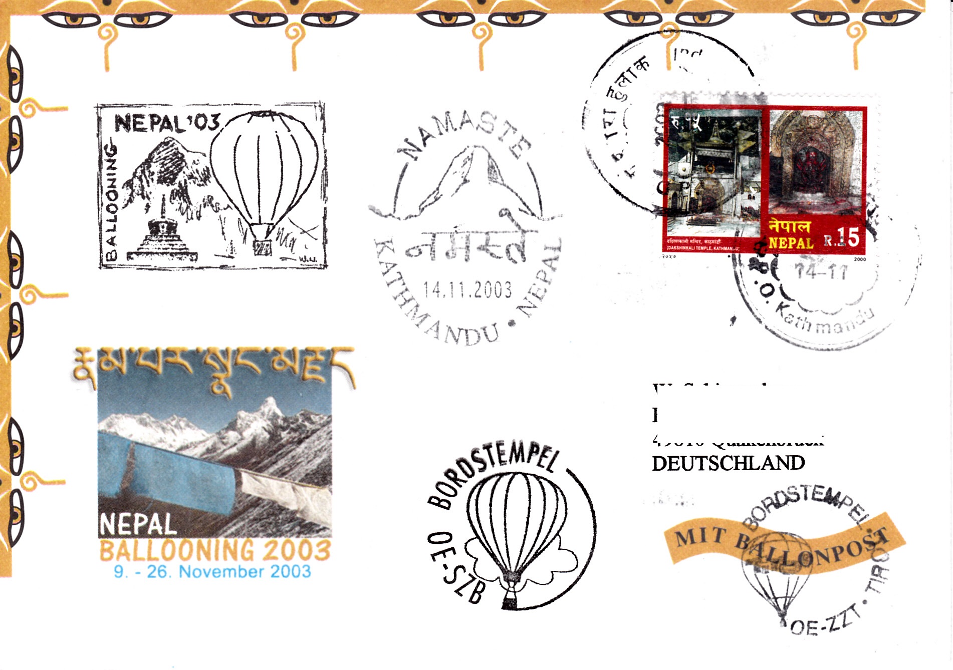 In Nepal wurde der 60. Sonder-Ballonpostflug der Österreichischen Pro Juventute am 14.11.2003 in Vilnius durchgeführt. Bei diesem Beleg stellt sich mir die Frage, mit welchem Ballon? Der Brief trägt zwei verschiedene Bordstempel: OE-SZB und OE-ZZT!