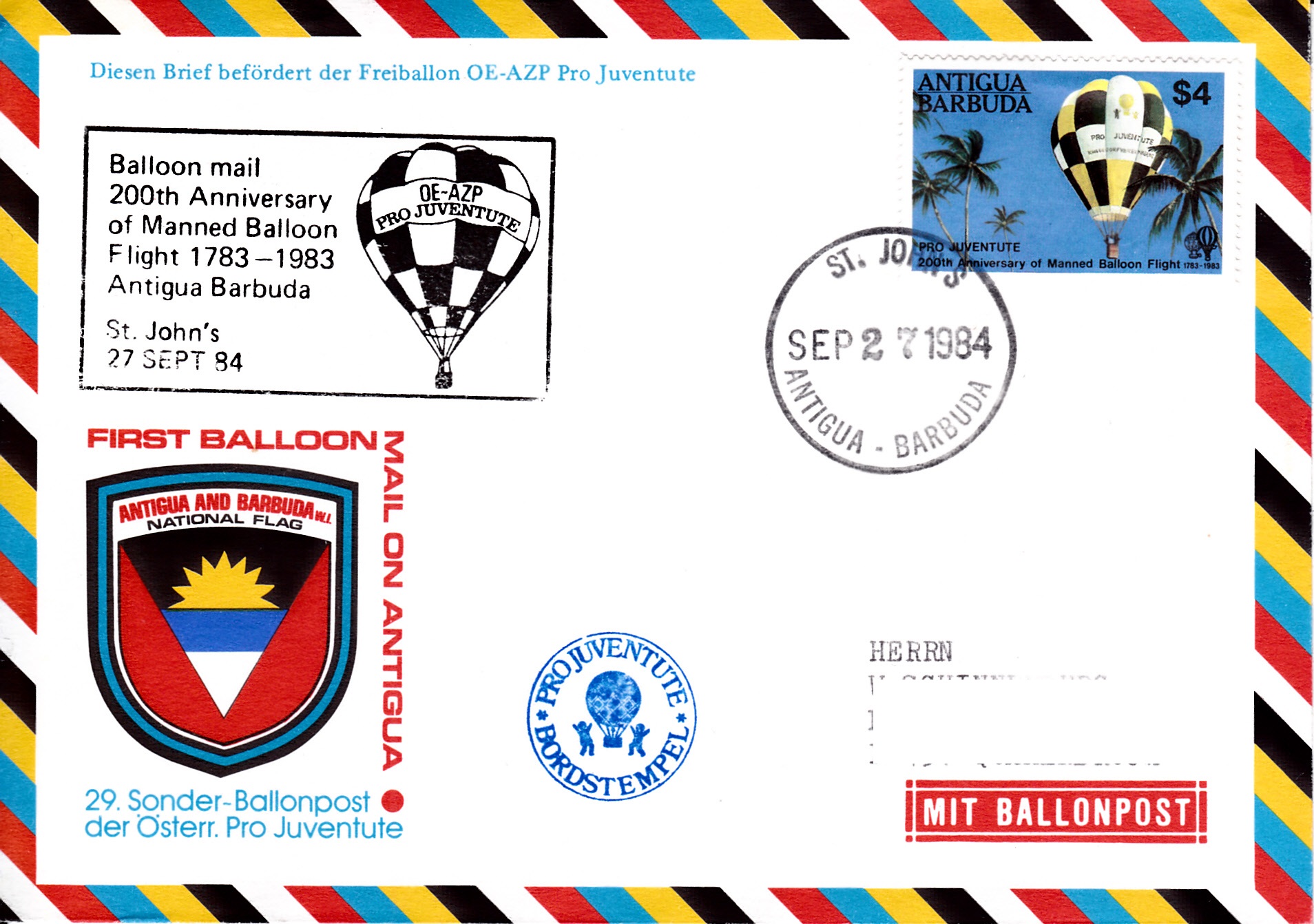Einige Ballonpostflüge fanden auch in Übersee statt. So der 29. Sonder-Ballonpostflug der Österreichischen Pro Juventute mit dem Freiballon OE-AZP am 27.9.1984 in St. John's (Antigua und Barbuda).