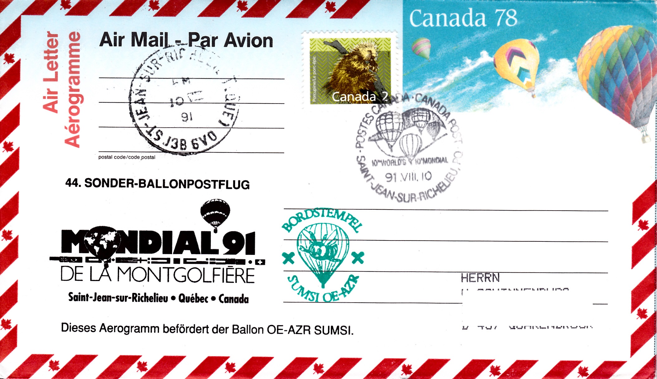 Dieses Aerogramm aus Kanada war mit dem 44. Sonder-Ballonpostflug der Österreichischen Pro Juventute mit dem Freiballon OE-AZR SUMSI am 10.8.1991 in Saint-Jean-sur-Richelieu unterwegs.