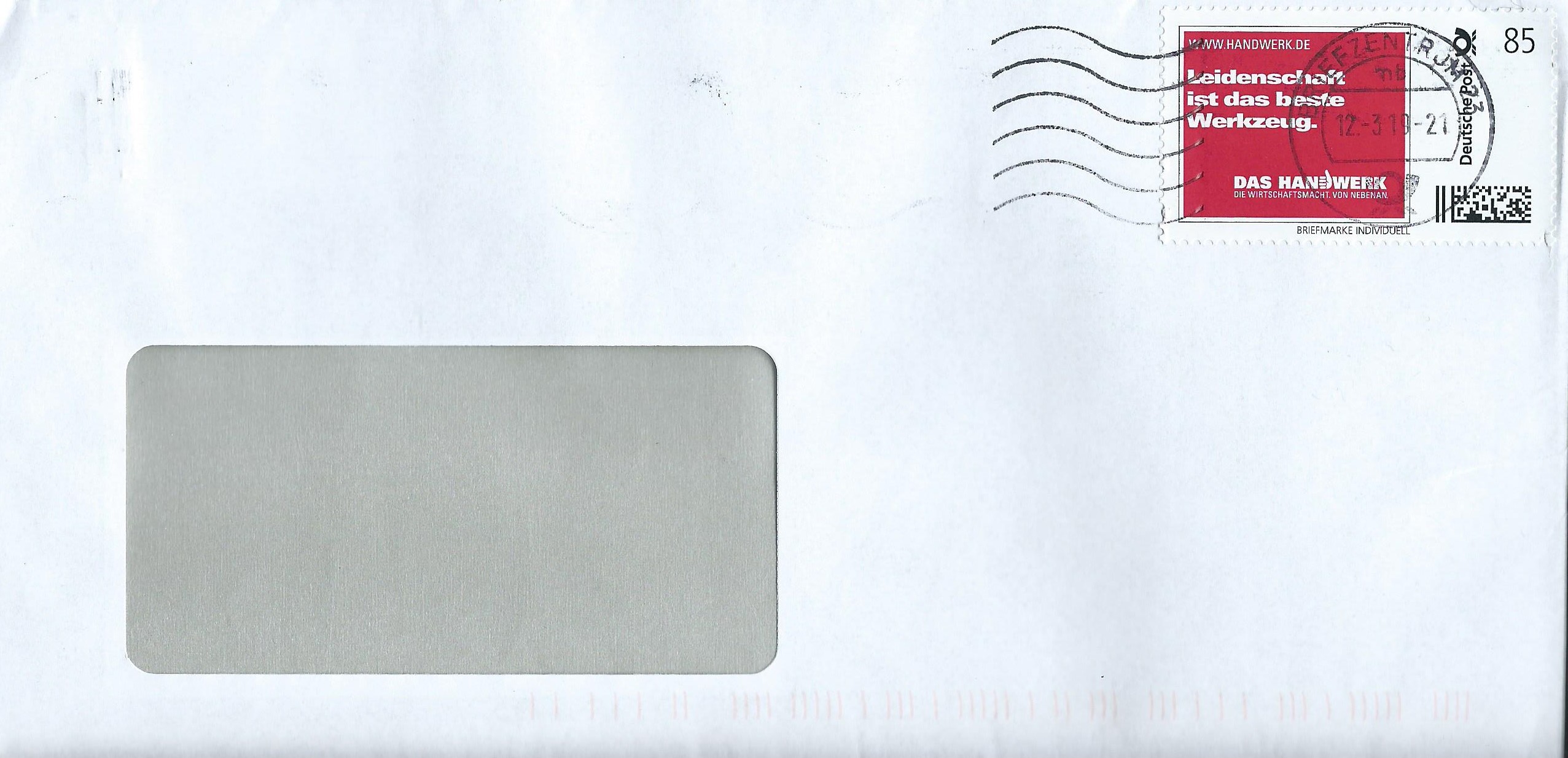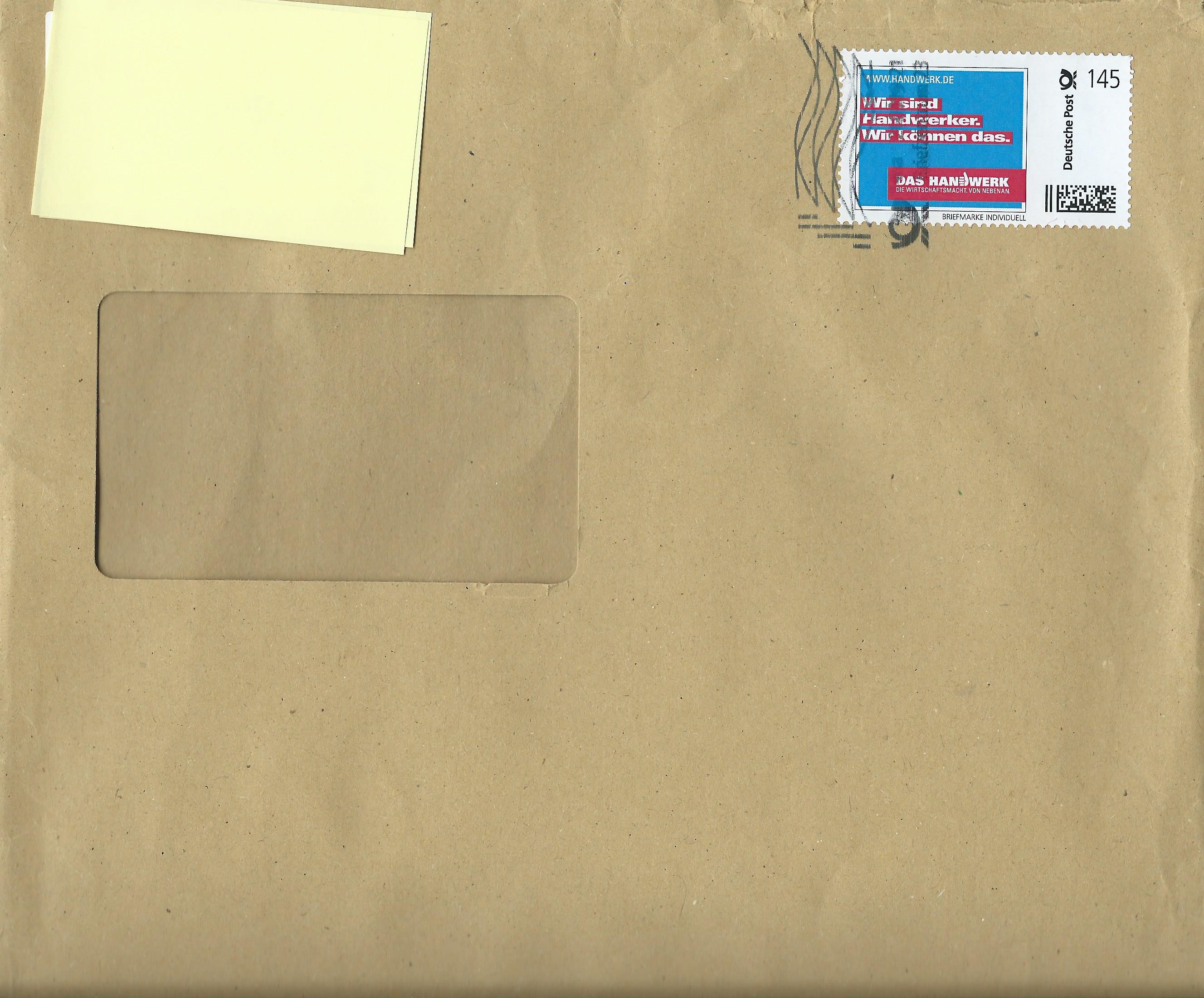 Und die Wertstufe zu 145 Cent (blauer Untergrund) mit dem Slogan „Wir sind Handwerker, wir können das“, gestempelt im Briefzentrum 23 am 2.4.19. Der Umschlag passte nicht ganz auf den Scanner, daher nur als Ausschnitt im Bild.