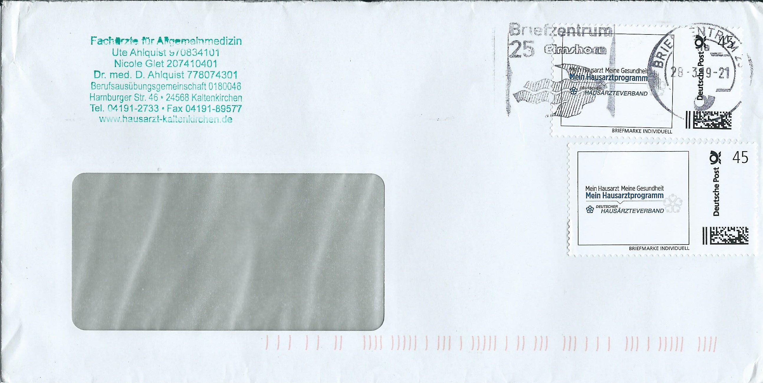 Zum ersten ein Beleg mit 2 Marken zu 45 ct mit dem Schriftzug „Mein Hausarzt Meine Gesundheit Mein Hausarztprogramm / Deutscher Hausärzteverband“, gestempelt am 28.3.19 im Briefzentrum 25: