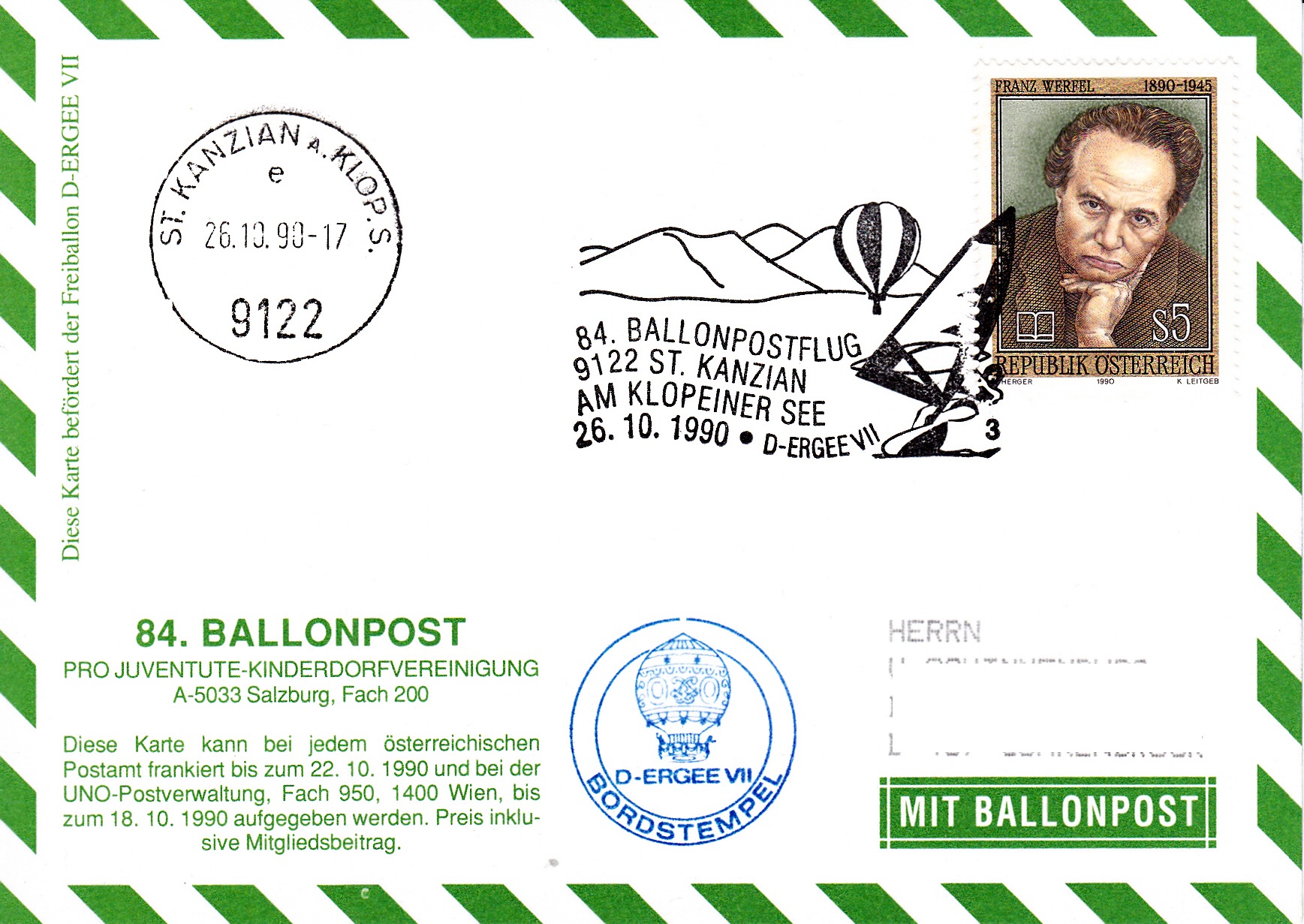 Diese Postkarte wurde am 26.10.1990 in St. Kanzian am Klopeiner See für den 84. Ballonpostflug der Österreichischen Pro Juventute mit dem Ballon D-ERGEE VII aufgegeben. Sie erhielt den Sonderstempel mit der Kennziffer "3" aus St. Kanzian am Klopeiner See zu diesem Ballonflug und wurde am gleichen Tag mit dem Ballon D-ERGEE VII befördert. Sie erhielt zusätzlich einen Tagesstempel St. Kanzian A. Klop. S. mit dem Kennbuchstaben "e" und einen Bordstempel.