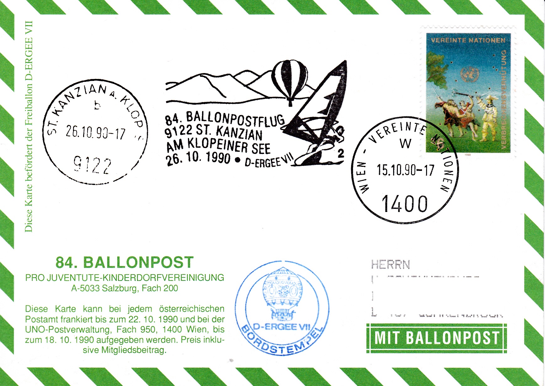 Diese Karte wurde am 15.10.1990 bei der UN-Postverwaltung Wien für den 84. Ballonpostflug der Österreichischen Pro Juventute mit dem Ballon D-ERGEE VII aufgegeben und mit dem Tagesstempel mit dem Kennbuchstaben "w" gestempelt. Am 26.10.1990 wurde sie mit dem Ballon D-ERGEE VII befördert. Die Karte erhielt an diesem Tag den Sonderstempel aus St. Kanzian am Klopeiner See mit der Kennziffer "2" zu diesem 84. Ballonpostflug, einen Tagesstempel aus St. Kanzian A. Klop. S. mit dem Kennbuchstaben "b" und einen Bordstempel.