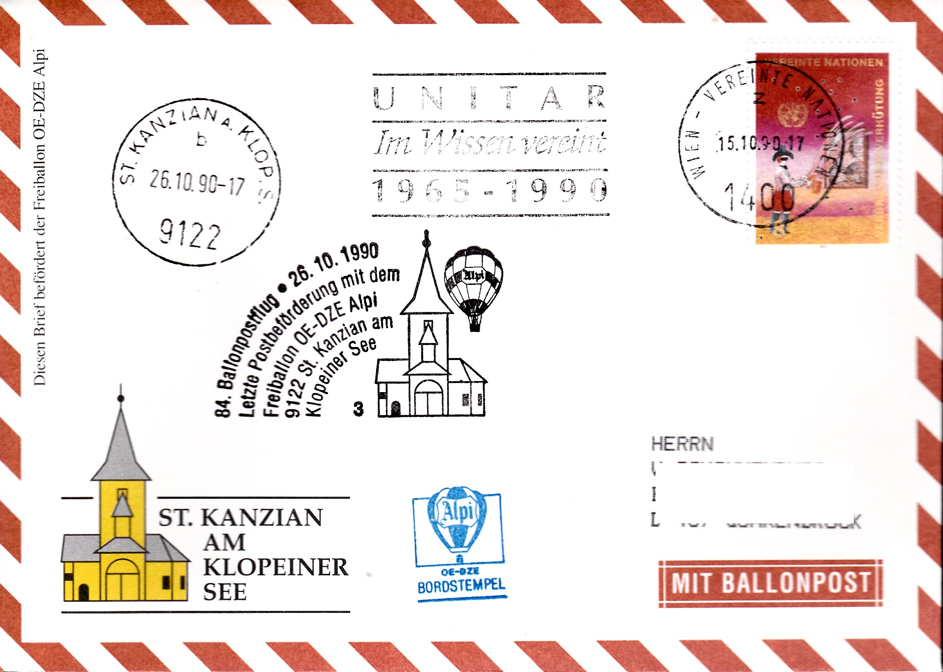 Dieser Umschlag wurde am 15.10.1990 bei der UN-Postverwaltung Wien für den 84. Ballonpostflug der Österreichischen Pro Juventute mit dem Ballon OE-DZE aufgegeben und mit dem Maschinen-Werbestempel mit dem Kennbuchstaben "z" mit dem Werbeeinsatz "UNITAR Im Wissen vereint 1965 - 1990" gestempelt. Am 26.10.1990 wurde er mit dem Ballon OE-DZE befördert. Der Umschlag erhielt an diesem Tag den Sonderstempel aus St. Kanzian am Klopeiner See mit der Kennziffer "2" zu diesem 84. Ballonpostflug, einen Tagesstempel aus St. Kanzian A. Klop. S. mit dem Kennbuchstaben "b" und einen Bordstempel.