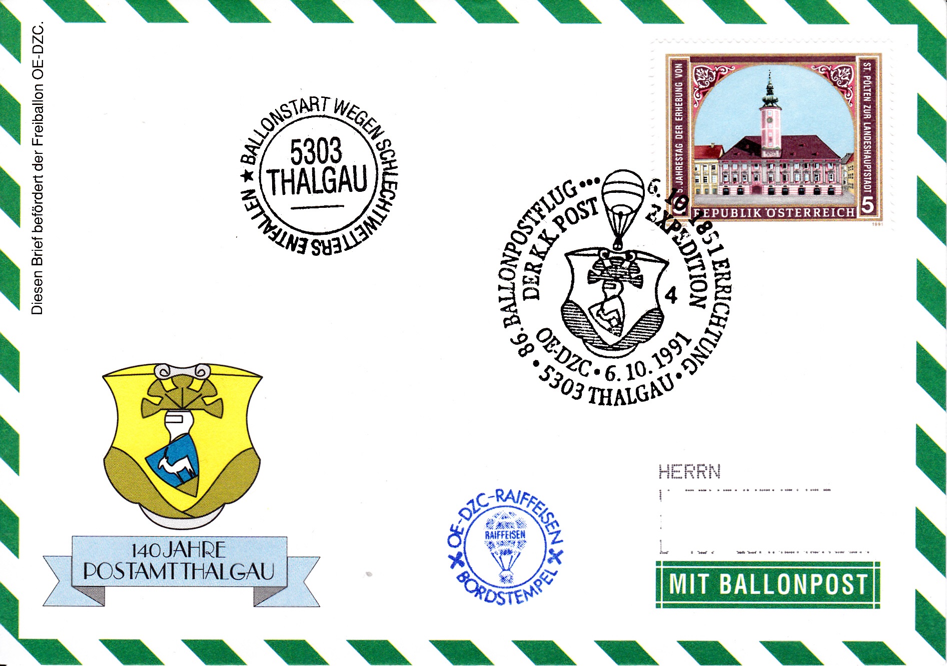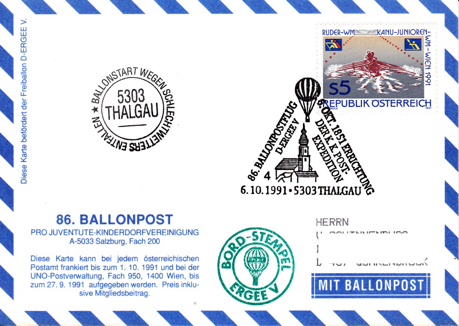 Dieser Umschlag wurde am 6.10.1991 in Thalgau für den 86. Ballonpostflug der Österreichischen Pro Juventute mit dem Ballon OE-DZC-Raiffeisen aufgegeben. Er erhielt den Sonderstempel mit der Kennziffer "4" aus Thalgau zu diesem Ballonflug. Da der Ballonflug wegen schlechtem Wetter ausgefallen ist wurden auf der Karte ein "Ausfallstempel" und ein Bordstempel angebracht.