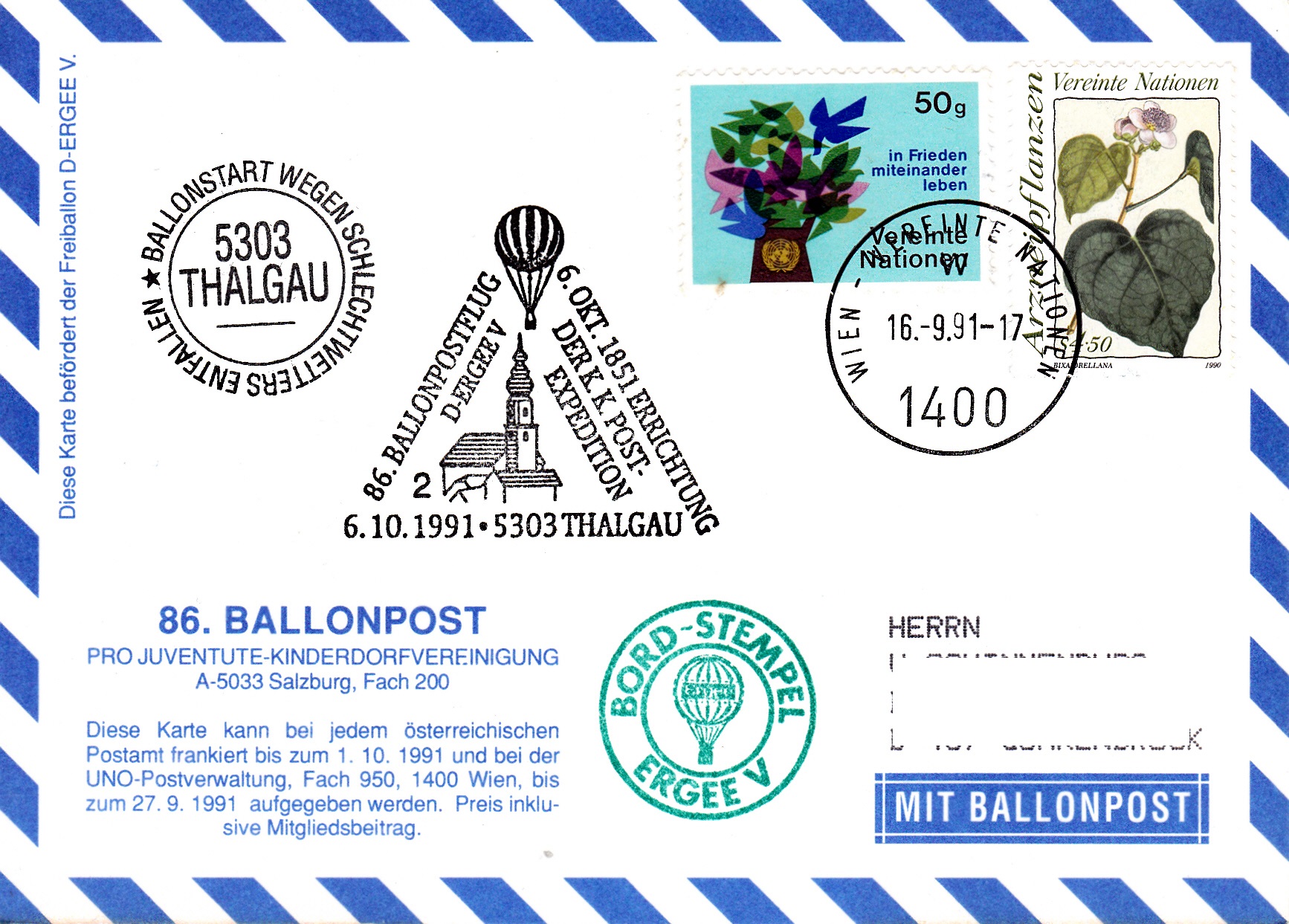 Diese Karte wurde am 16.9.1991 bei der UN-Postverwaltung Wien für den 86. Ballonpostflug der Österreichischen Pro Juventute mit dem Ballon ERGEE V aufgegeben und mit dem Tagesstempel mit dem Kennbuchstaben "w" gestempelt. Die Karte erhielt am 6.10.1991 den Sonderstempel aus Thalgau mit der Kennziffer "2" zu diesem 86. Ballonpostflug. Da der Ballonflug wegen schlechtem Wetter ausgefallen ist wurden auf der Karte ein "Ausfallstempel" und ein Bordstempel angebracht.
