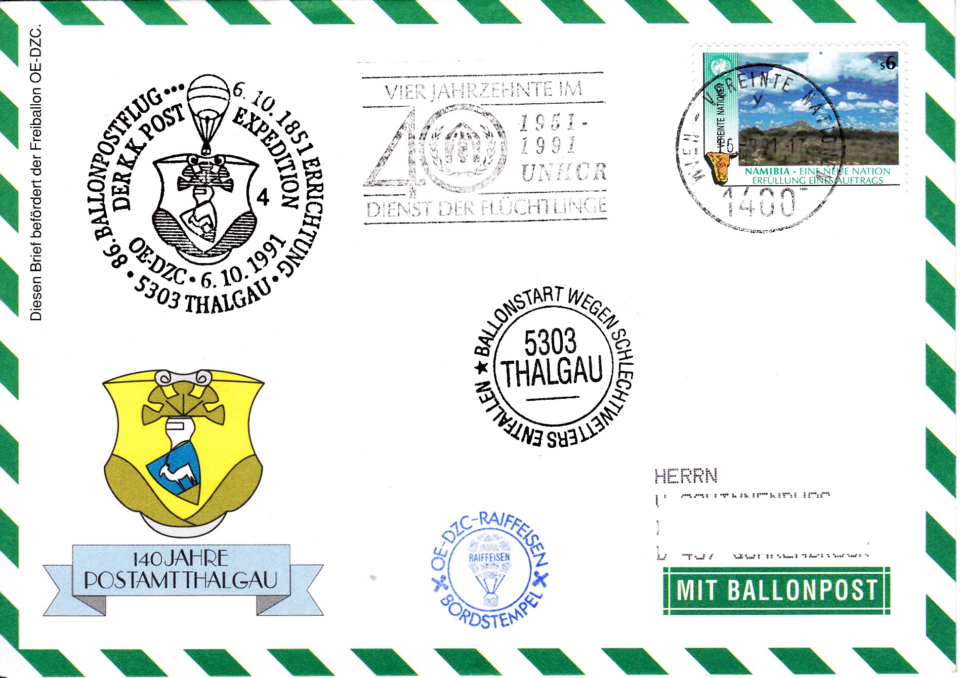 Dieser Umschlag wurde am 16.9.1991 bei der UN-Postverwaltung Wien für den 86. Ballonpostflug der Österreichischen Pro Juventute mit dem Ballon OE-DZC-Raiffeisen aufgegeben und mit dem Maschinen-Werbestempel mit dem Kennbuchstaben "y" mit dem Werbeeinsatz "VIER JAHRZEHNTE IM DIENST DER FLÜCHTLINGE; 1951-1991 UNHCR" gestempelt. Am 6.10.1991 erhielt er den Sonderstempel mit der Kennziffer "4" aus Thalgau zu diesem Ballonflug. Da der Ballonflug wegen schlechtem Wetter ausgefallen ist wurden auf der Karte ein "Ausfallstempel" und ein Bordstempel angebracht.