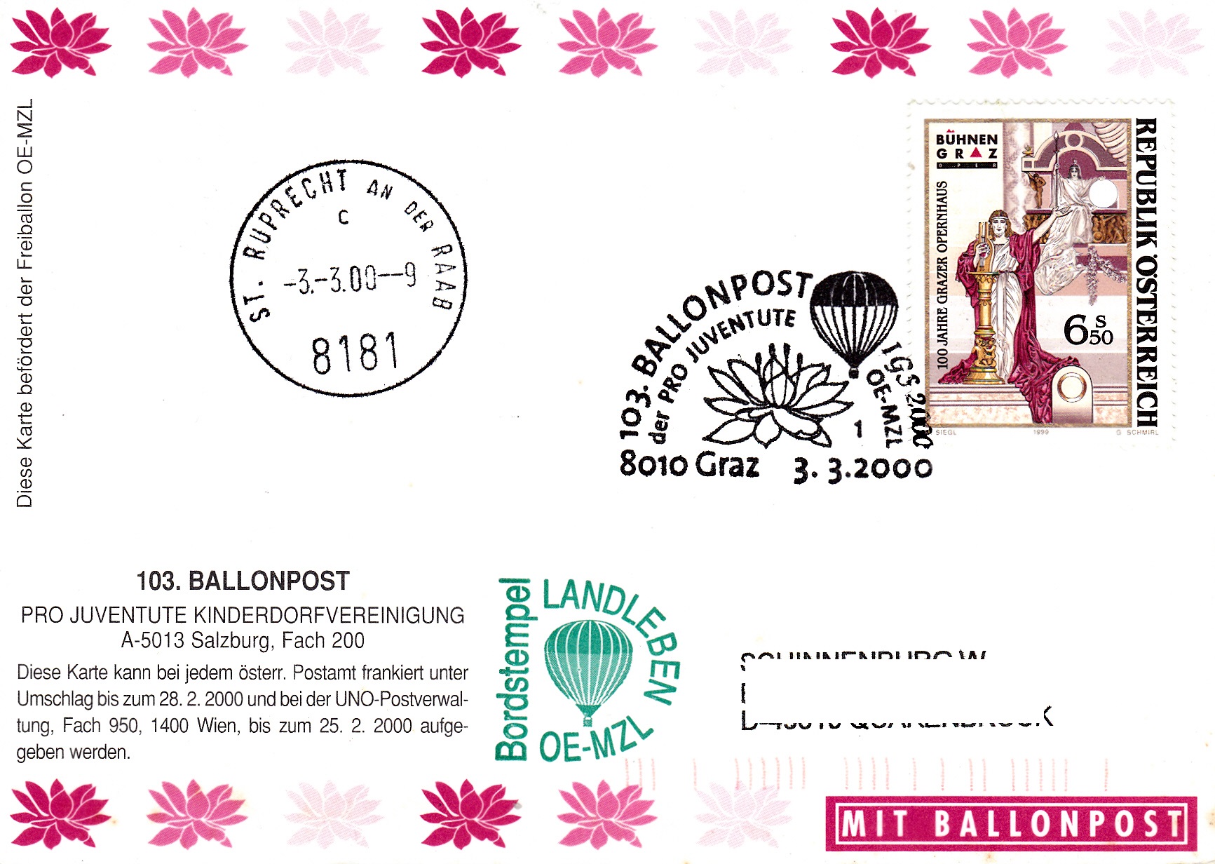 Diese Postkarte wurde am 3.3.2000 in Graz für den 103. Ballonpostflug der Österreichischen Pro Juventute mit dem Ballon OE-MZL Landleben aufgegeben. Sie erhielt den Sonderstempel mit der Kennziffer "1" aus Graz zu diesem Ballonflug und wurde am gleichen Tag mit dem Ballon OE-MZL Landleben befördert. Sie erhielt zusätzlich einen Tagesstempel St. Rupprecht an der Raab mit dem Kennbuchstaben "c" und einen Bordstempel.