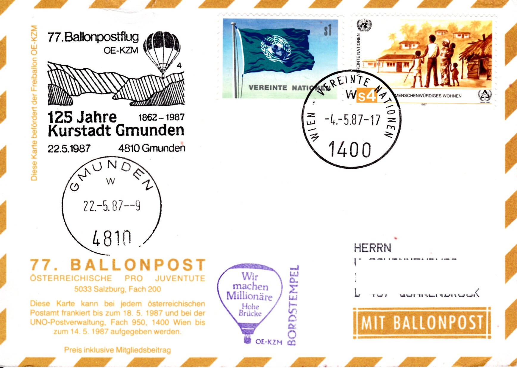 Diese Karte wurde am 4.5.1987 bei der UN-Postverwaltung Wien für den 77. Ballonpostflug der Österreichischen Pro Juventute mit dem Freiballon OE-KZM aufgegeben und mit Tagesstempel gestempelt. Am 22.5.1987 wurde sie mit dem Freiballon OE-KZM befördert. Die Karte erhielt an diesem Tag den Sonderstempel aus Gmunden mit der Kennziffer "4" zu diesem 77. Ballonpostflug, einen Tagesstempel aus Gmunden und einen Bordstempel.